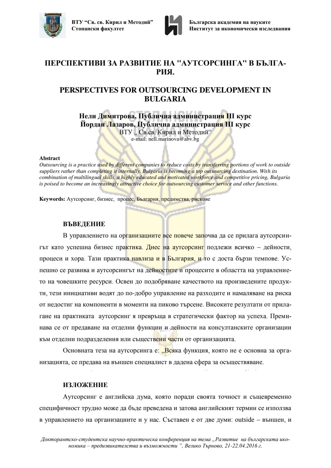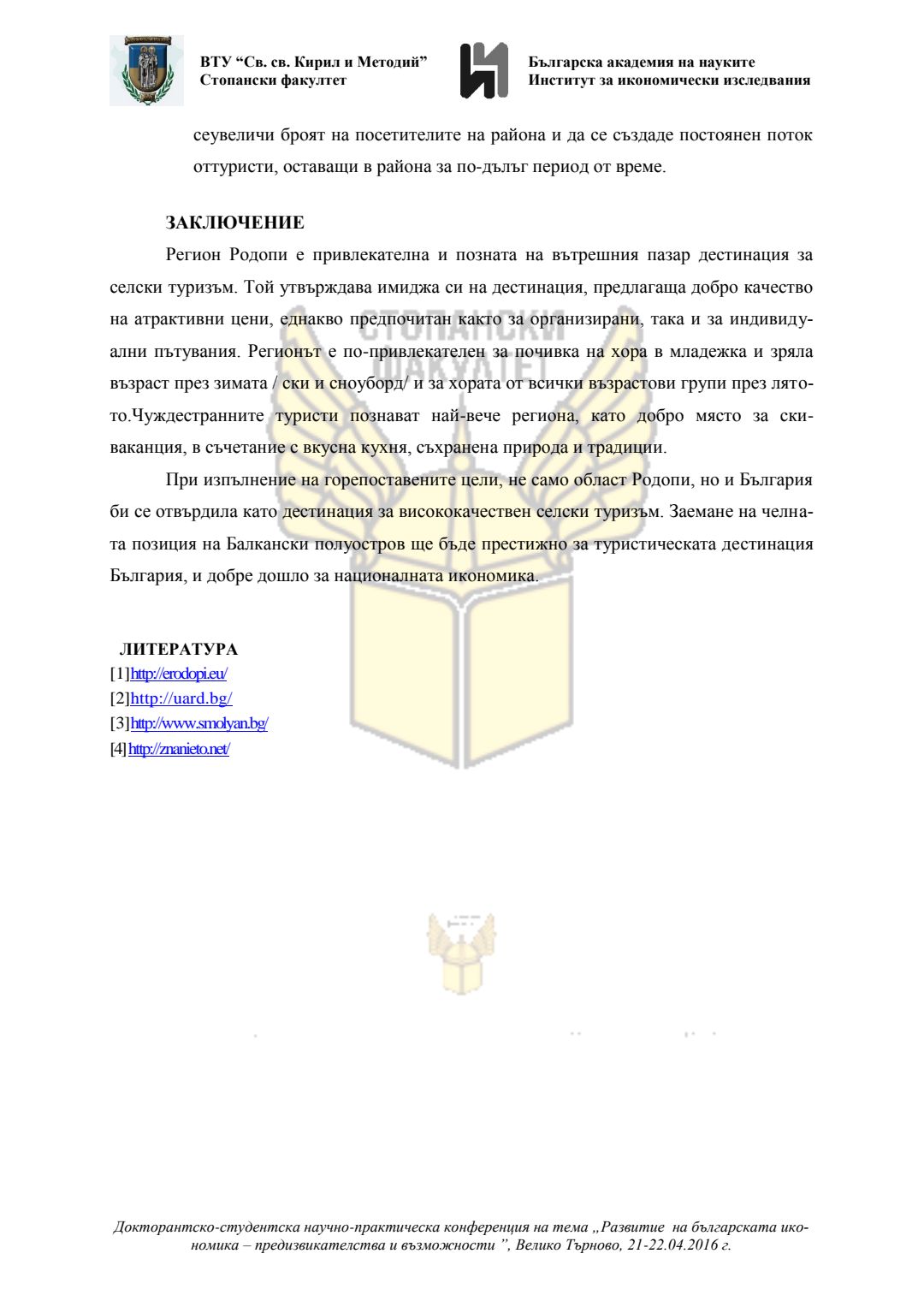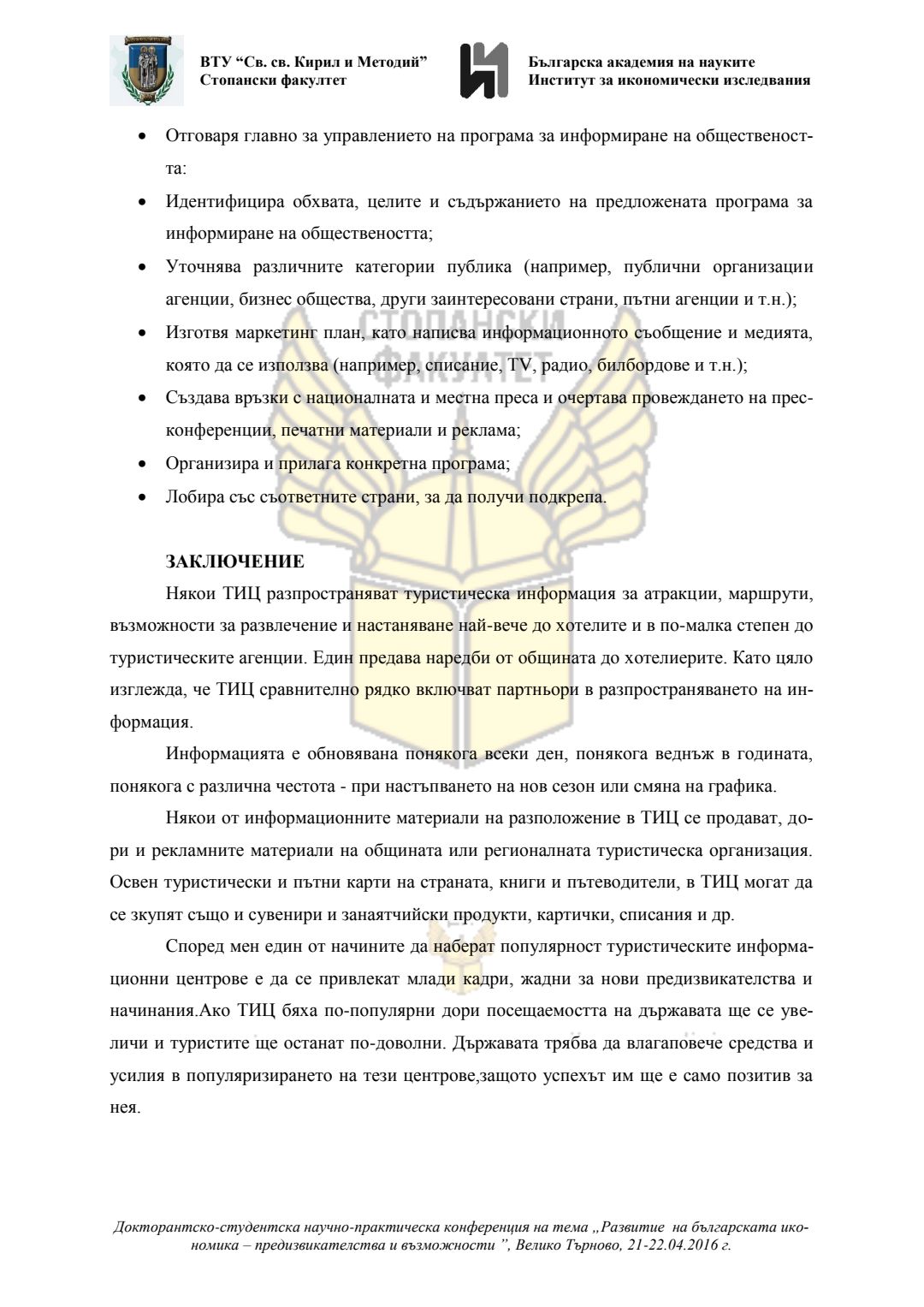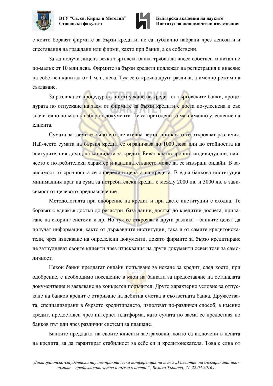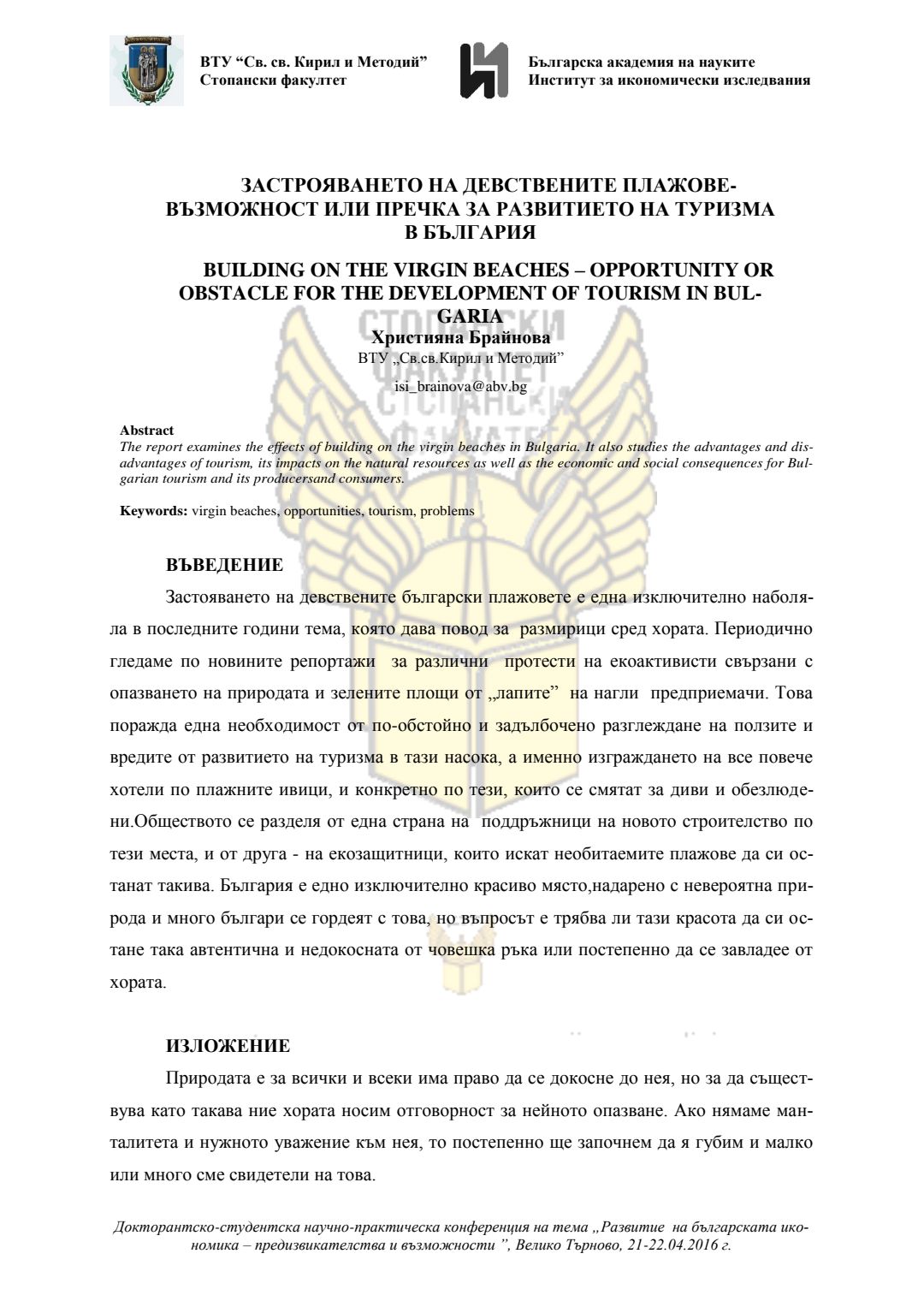 Докторантско-студентска научно-практическа конференция "Развитие на българската икономика - предизвикателства и възможности", 21 април 2016 г., Велико Търново : сборник с доклади