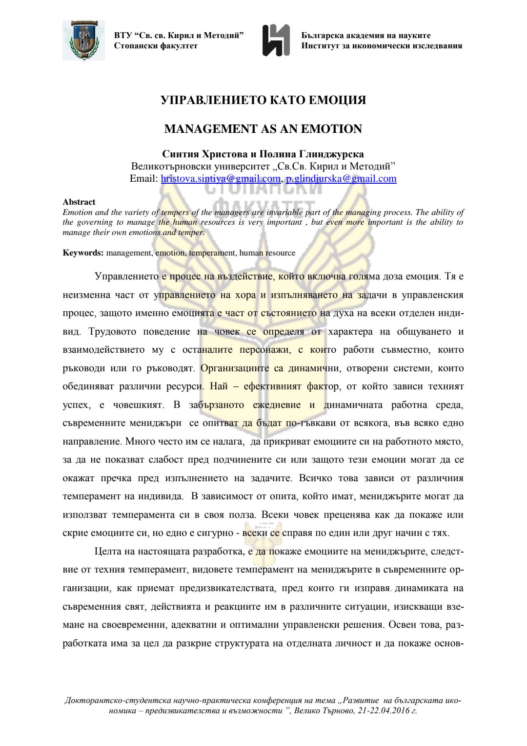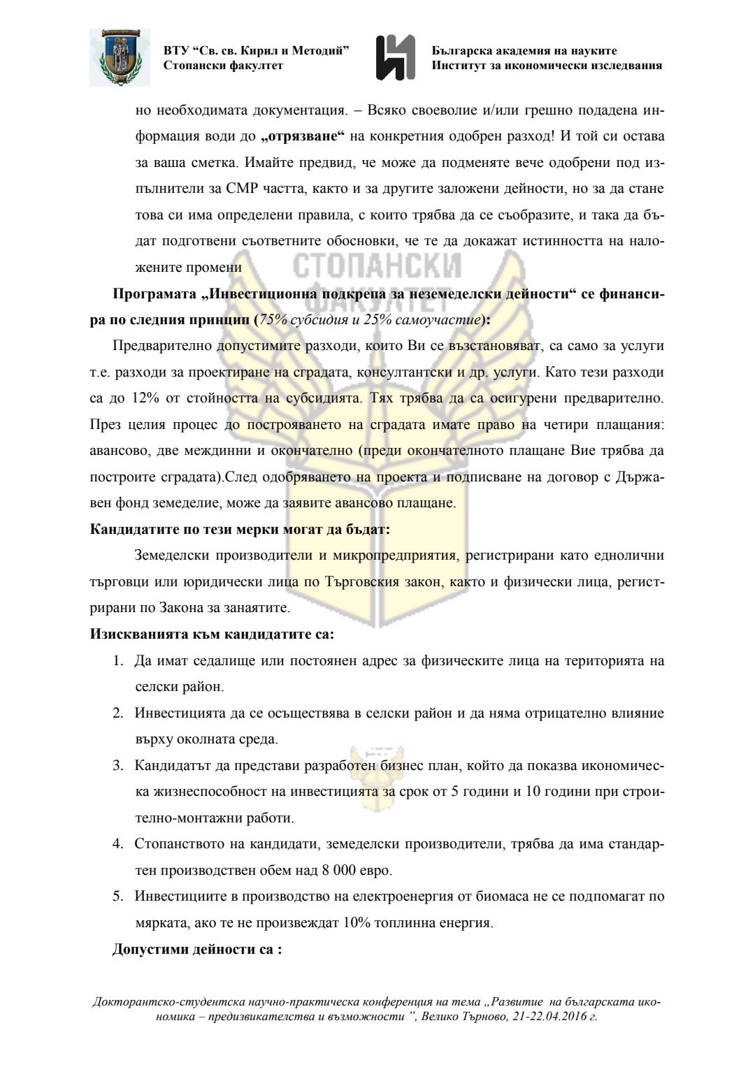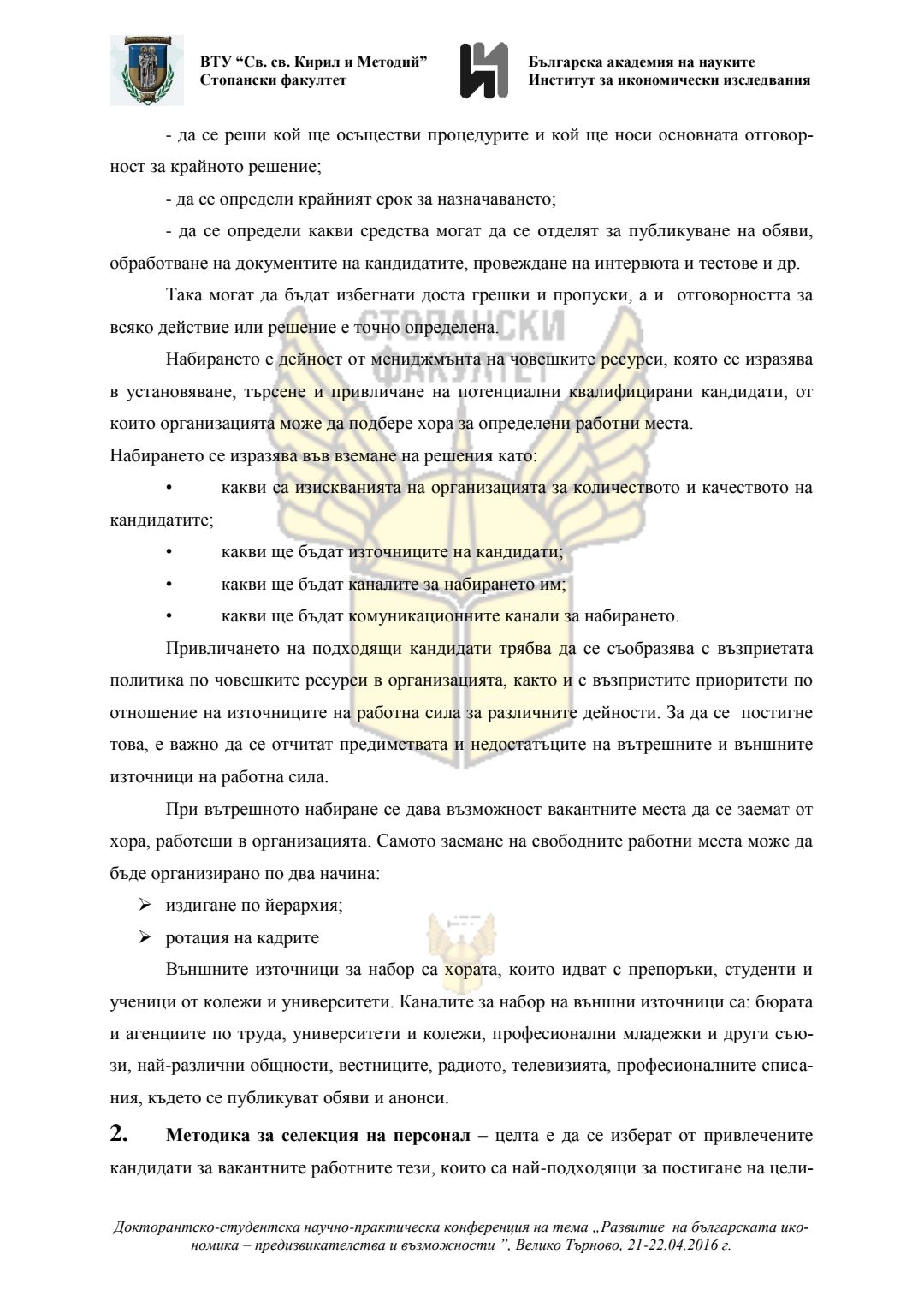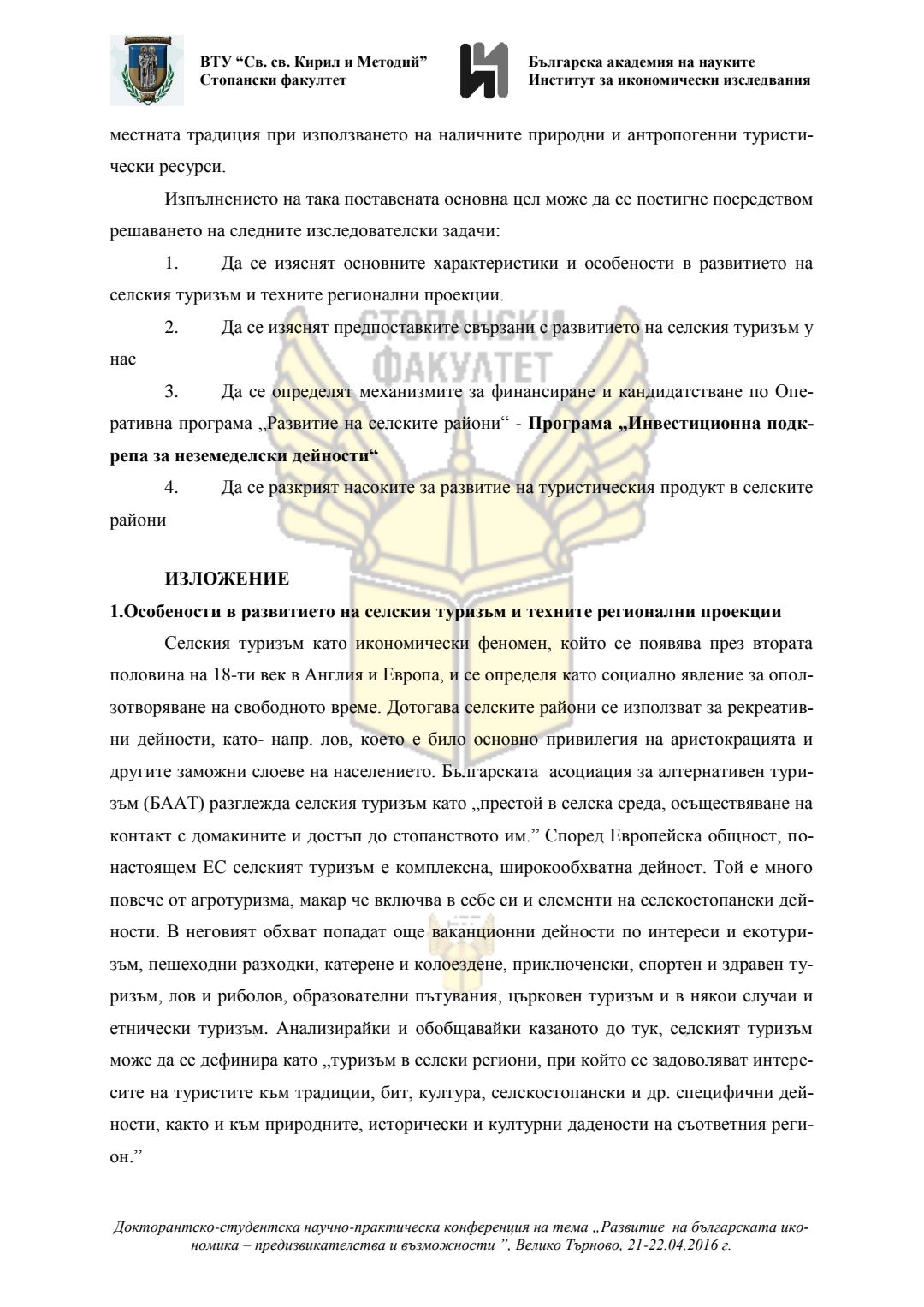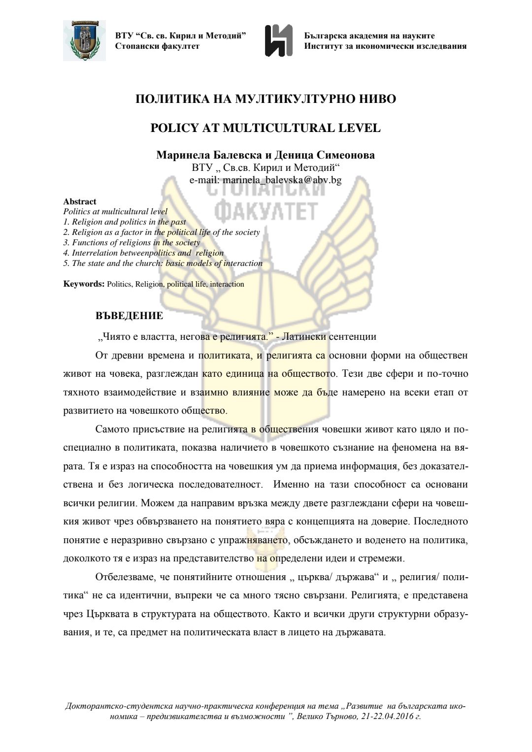 Докторантско-студентска научно-практическа конференция "Развитие на българската икономика - предизвикателства и възможности", 21 април 2016 г., Велико Търново : сборник с доклади