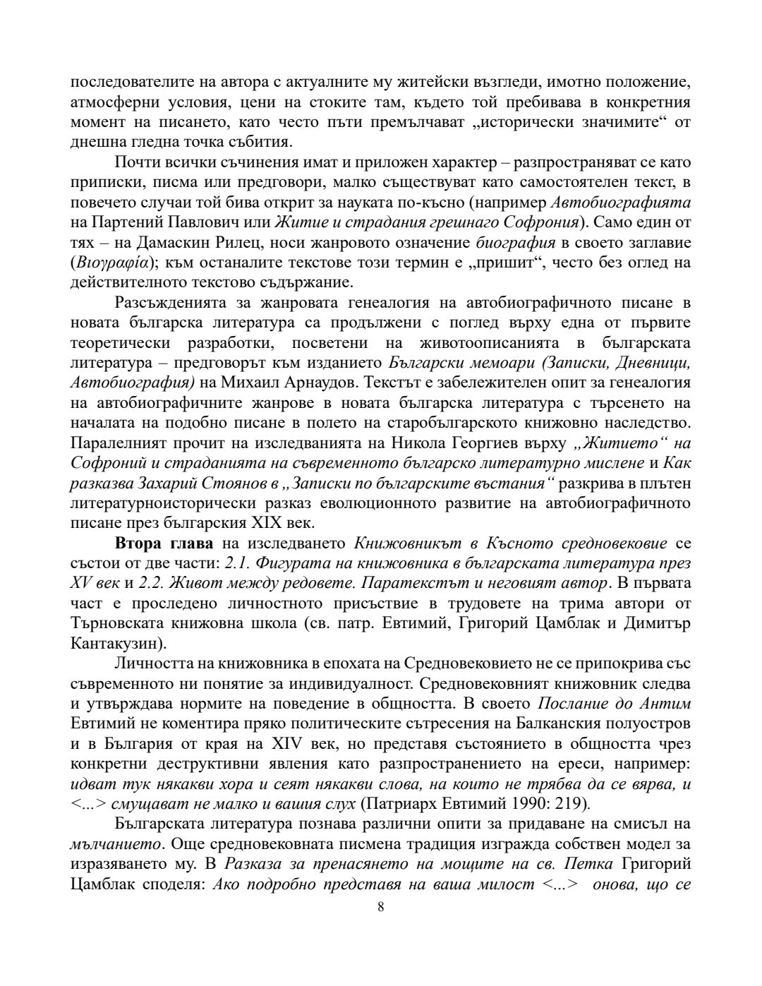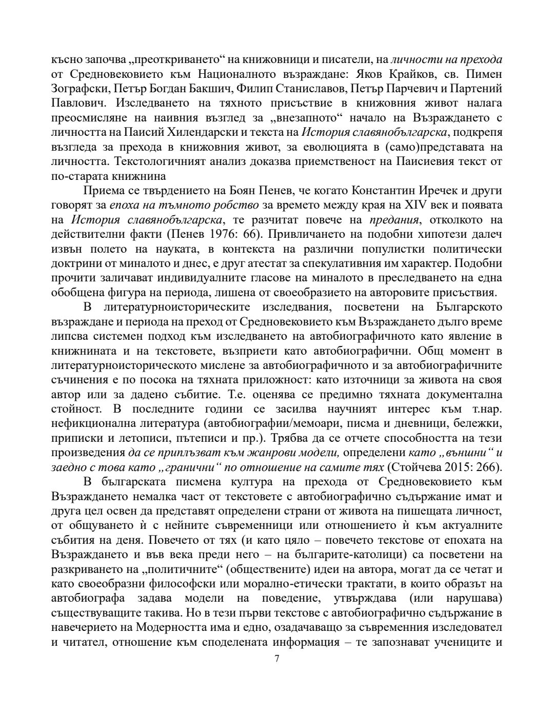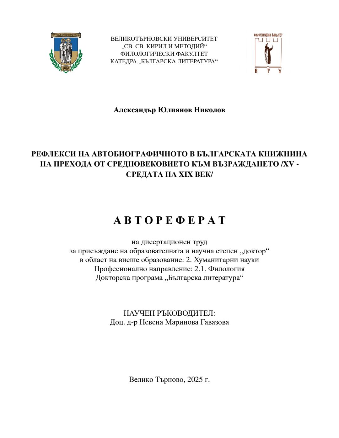Рефлекси на автобиографичното в българската книжнина на прехода от Средновековието към Възраждането (XV - средата на XIX век) : Автореферат / Александър Юлиянов Николов ; Научен ръководител Невена Гавазова