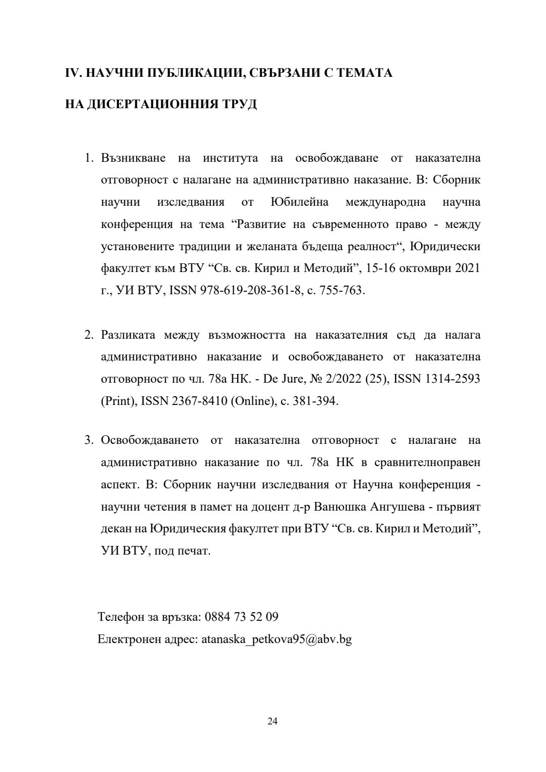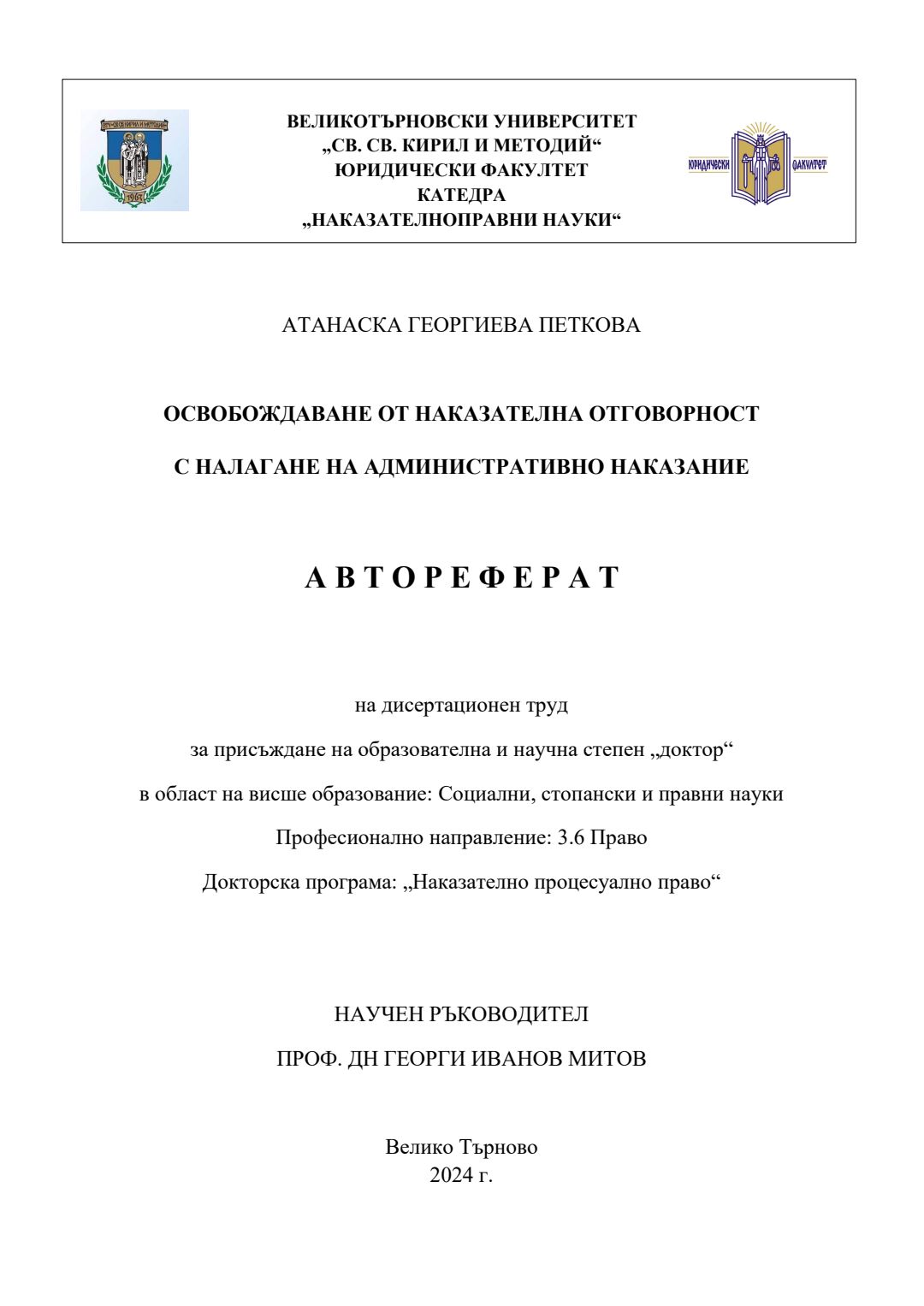 Освобождаване от наказателна отговорност с налагане на административно наказание : Автореферат / Атанаска Георгиева Петкова ; Науч. ръководител Георги Митов