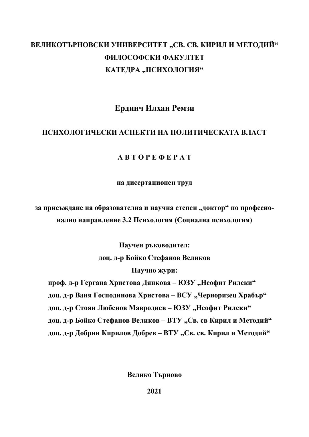 Психологически аспекти на политическата власт : Автореферат / Ердинч Илхан Ремзи ; Науч. ръководител Бойко Великов