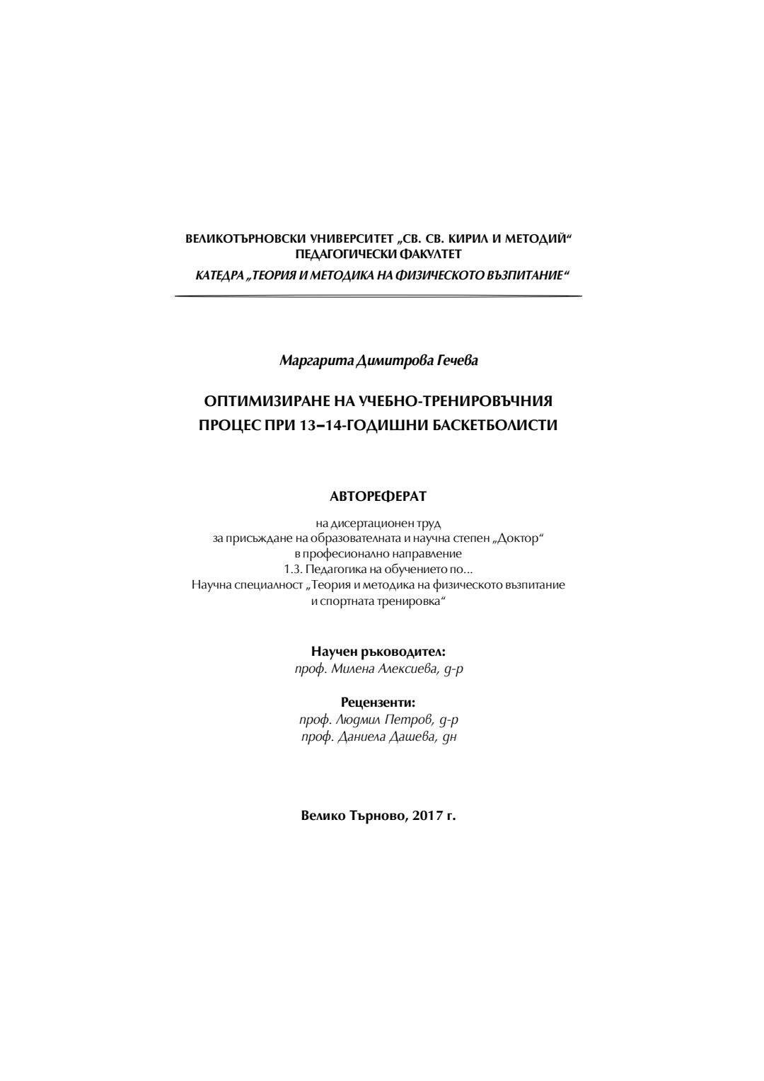 Оптимизиране на учебно-тренировъчния процес при 13-14-годишни баскетболисти : Автореферат / Маргарита Димитрова Гечева ; Науч. ръководител: Милена Алексиева