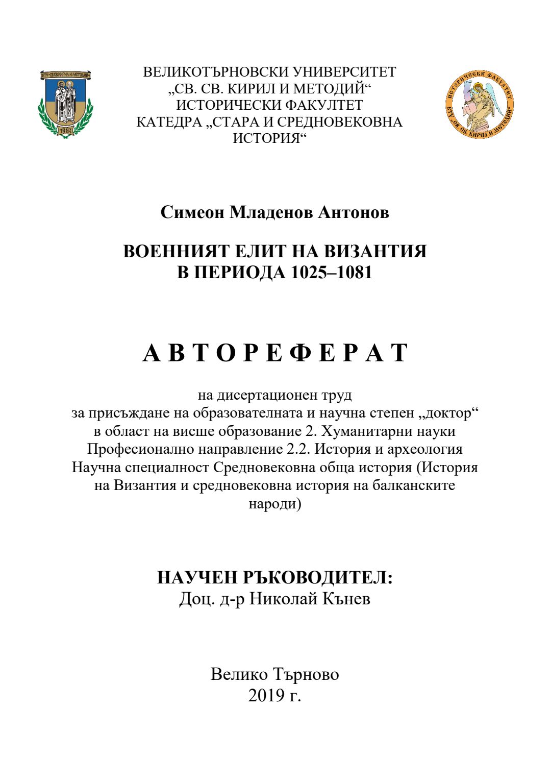 Военният елит на Византия в периода 1025-1081 : Автореферат / Симеон Младенов Антонов ; Науч. ръководител Николай Кънев