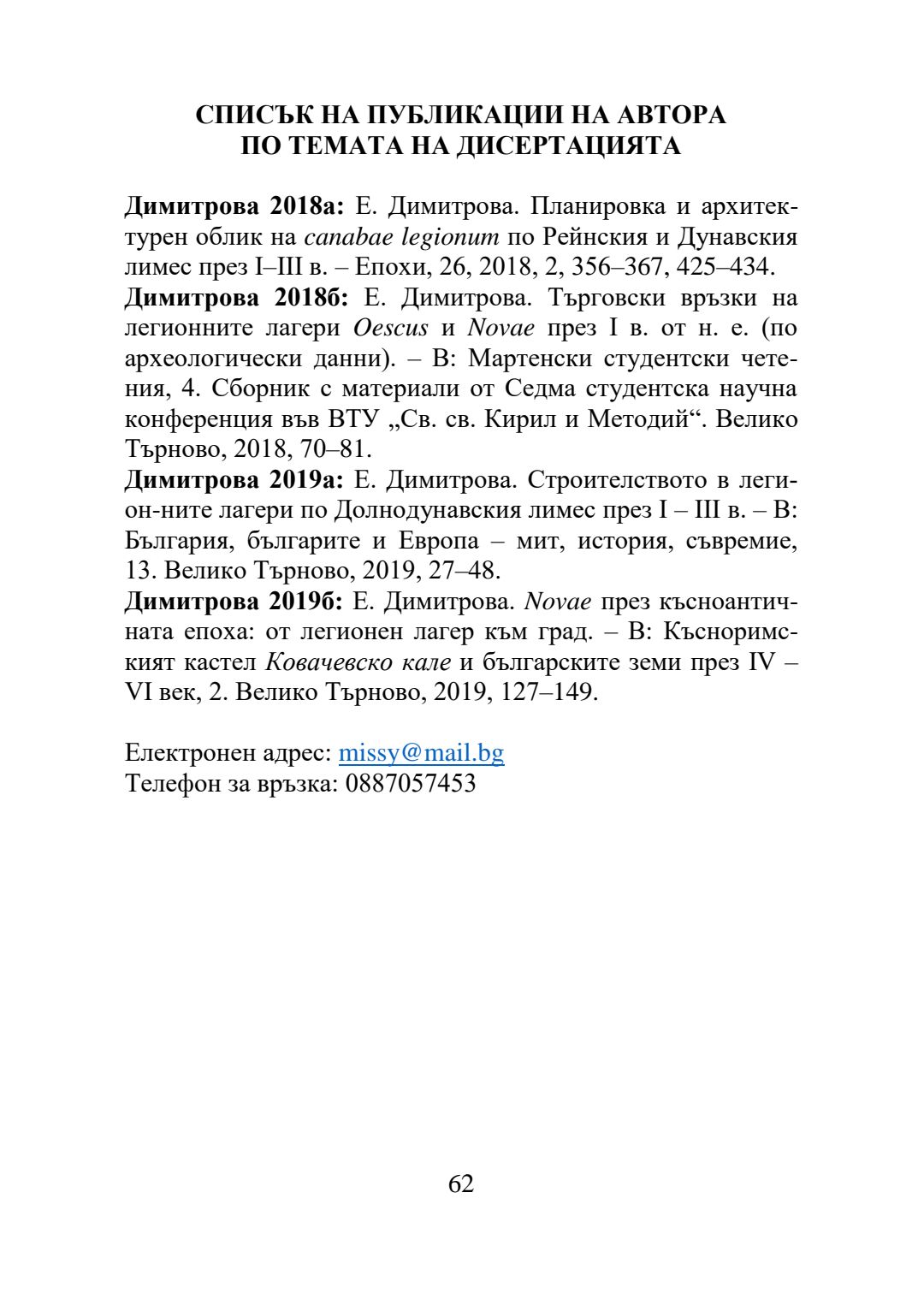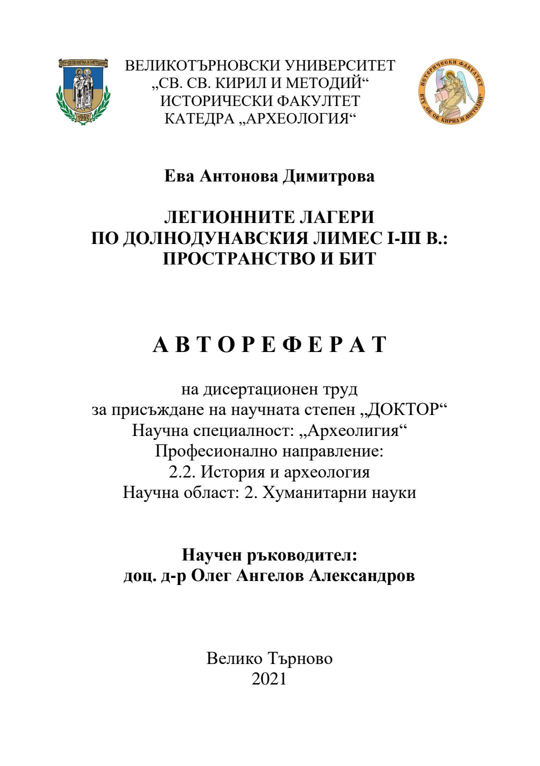 Легионните лагери по Долнодунавския лимес I-III в. : пространство и бит : Автореферат / Ева Антонова Димитрова ; Науч. ръководител Олег Александров