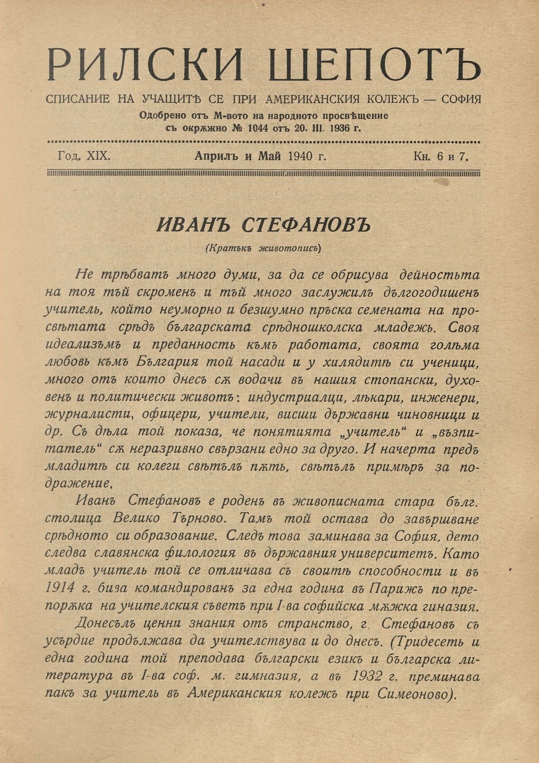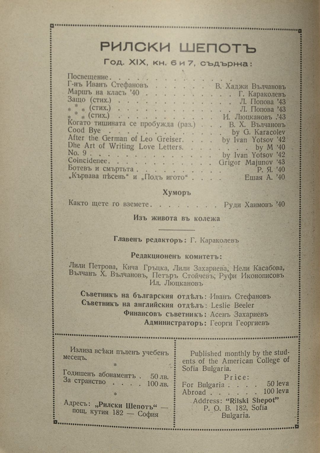 Год. 19, Кн.6-7. Рилски шепот : Орган на учащите се при Американския колеж - София / Американски колеж - София