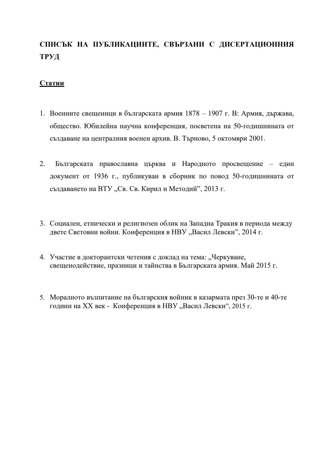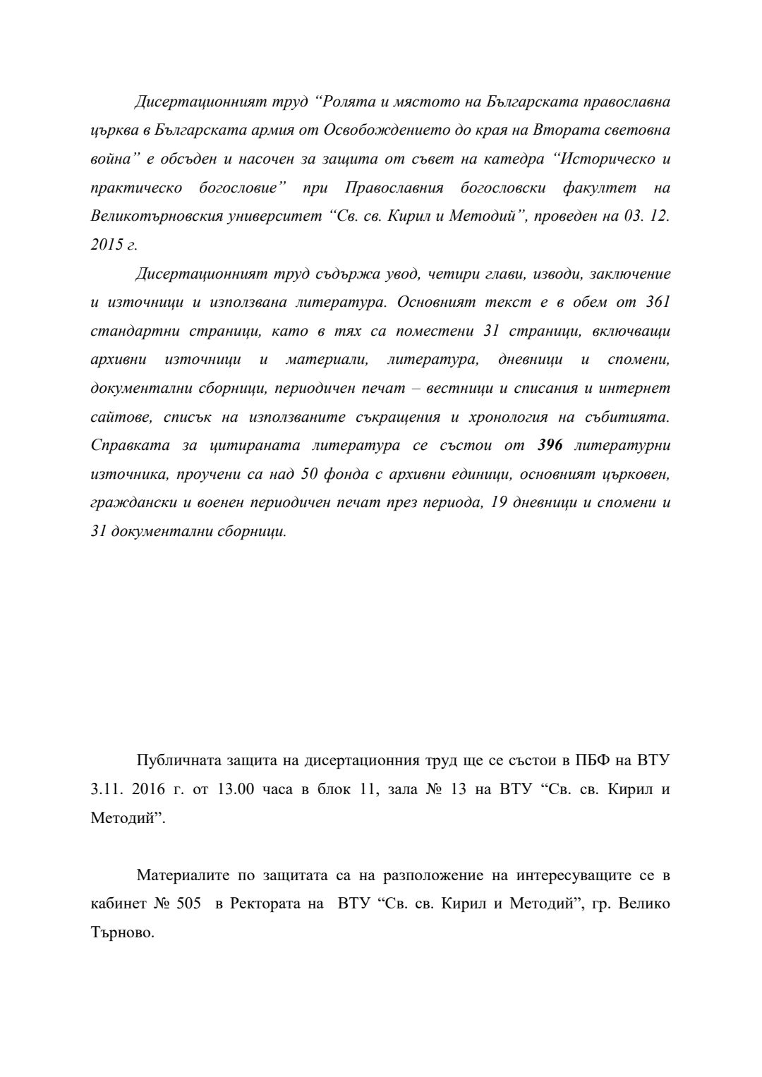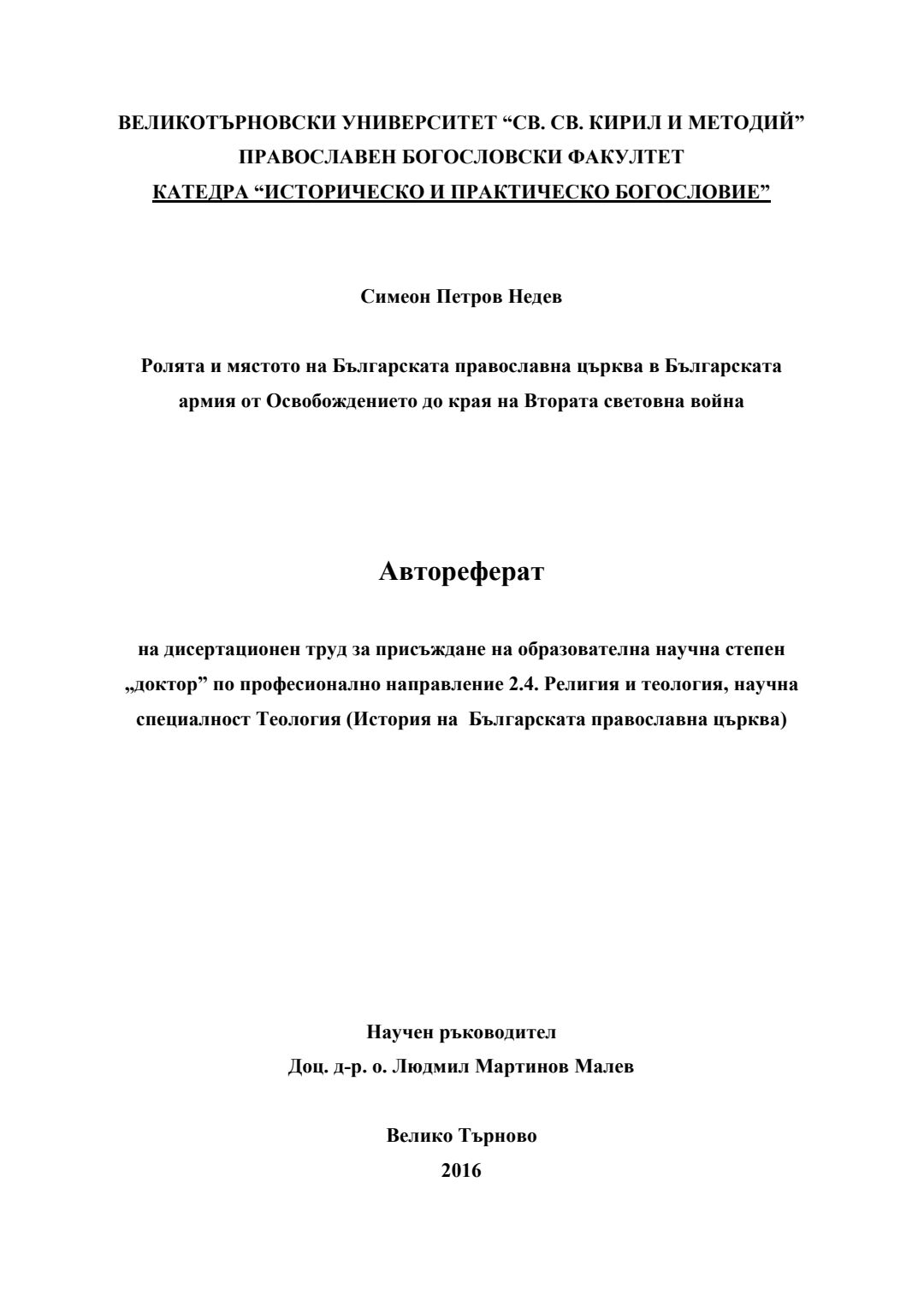 Ролята и мястото на Българската православна църква в Българската армия от Освобождението до края на Втората световна война : Автореферат / Симеон Петров Недев ; Науч. ръководител Людмил Малев