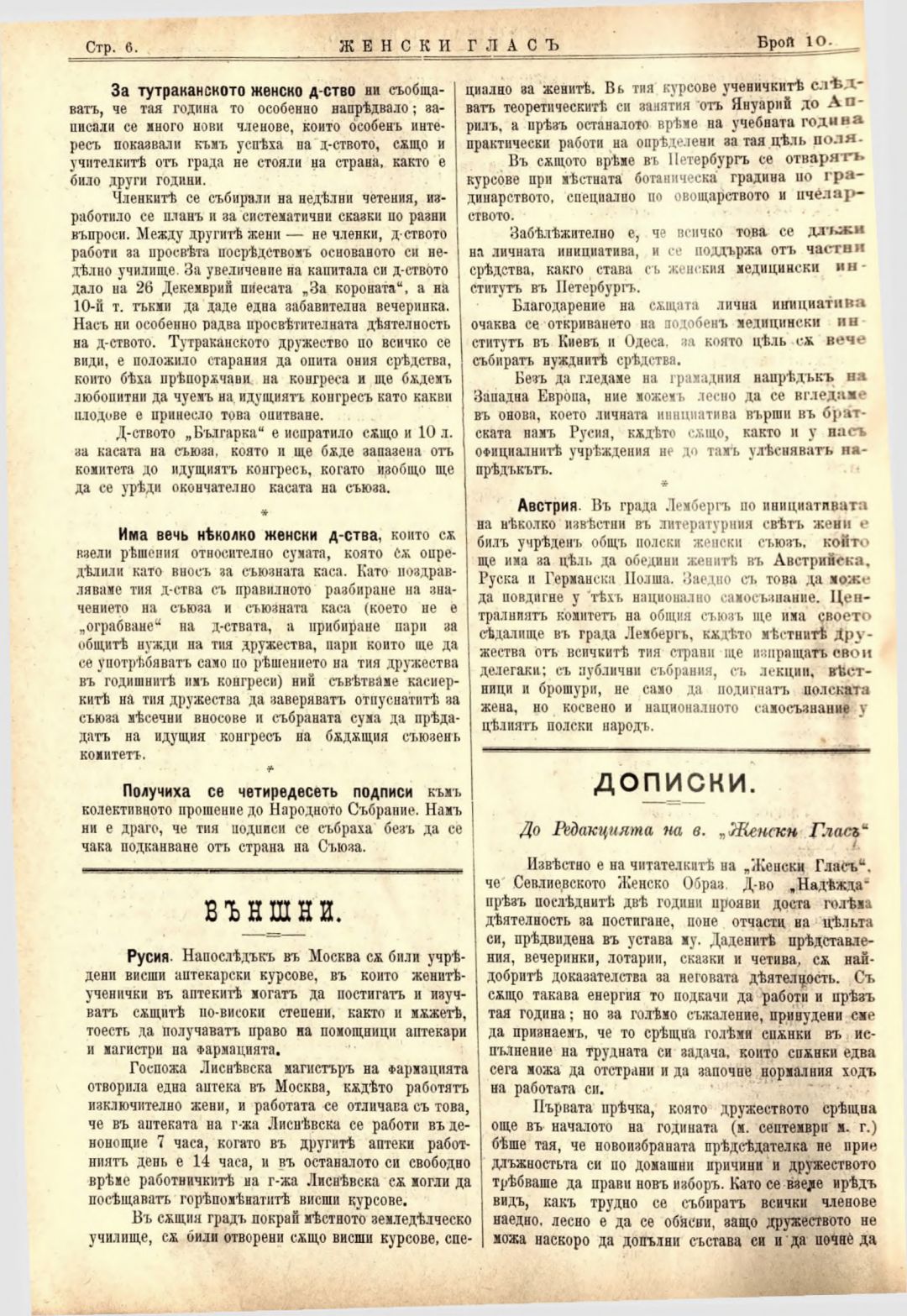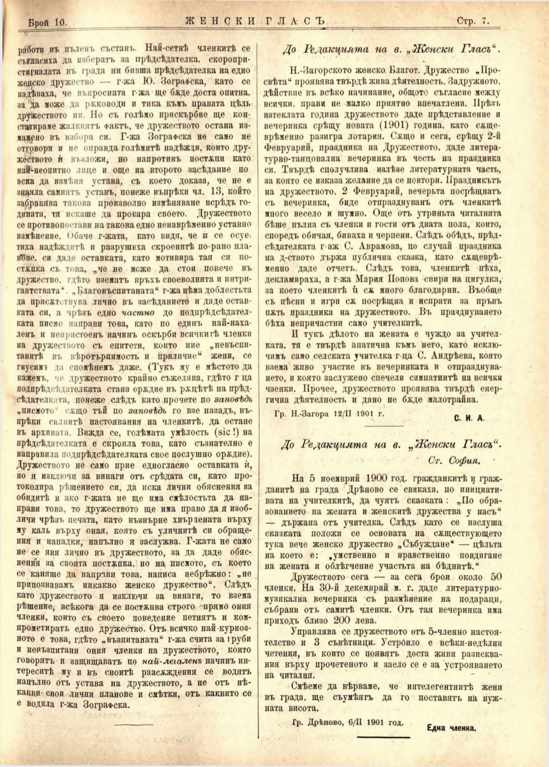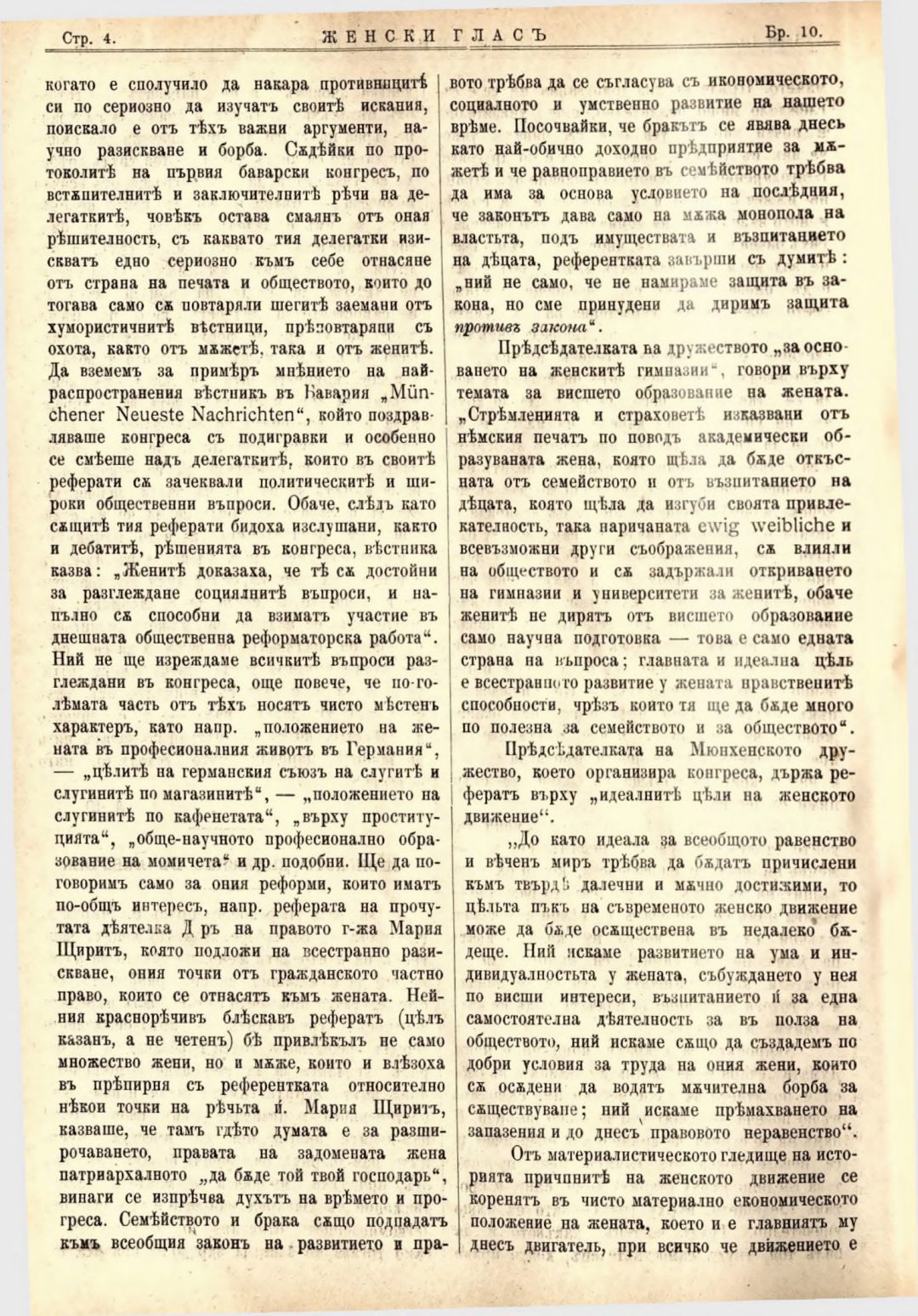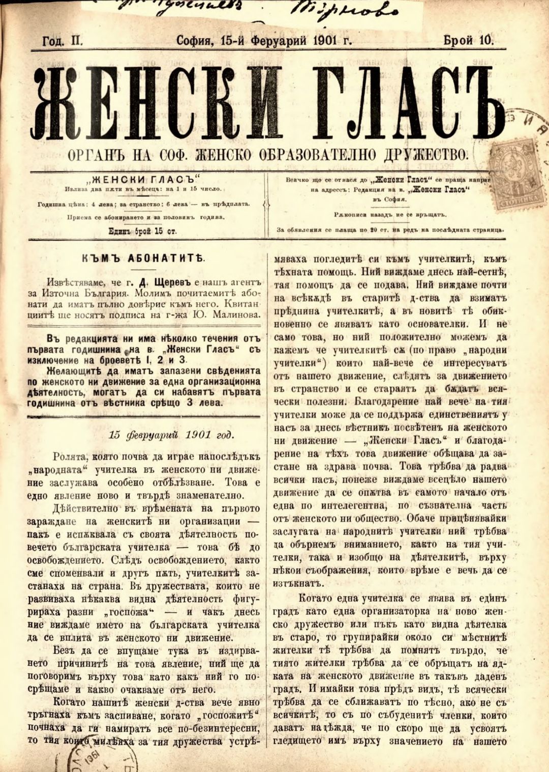 Год. 2,№ 10. Женски глас : Орган на софийското женско образователно дружество