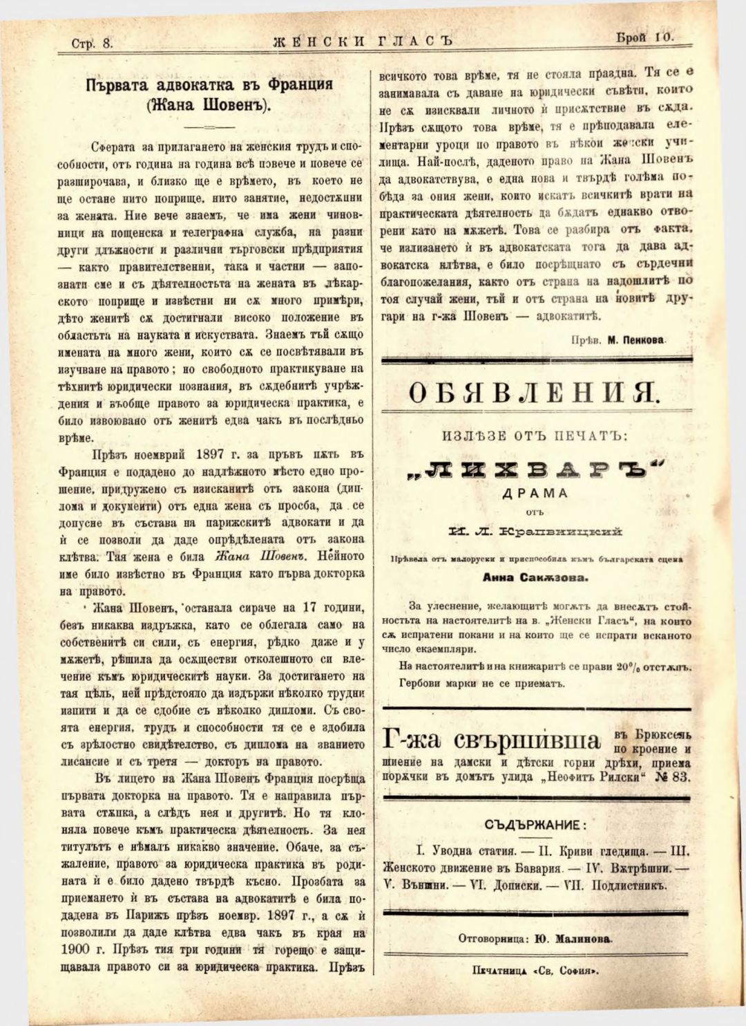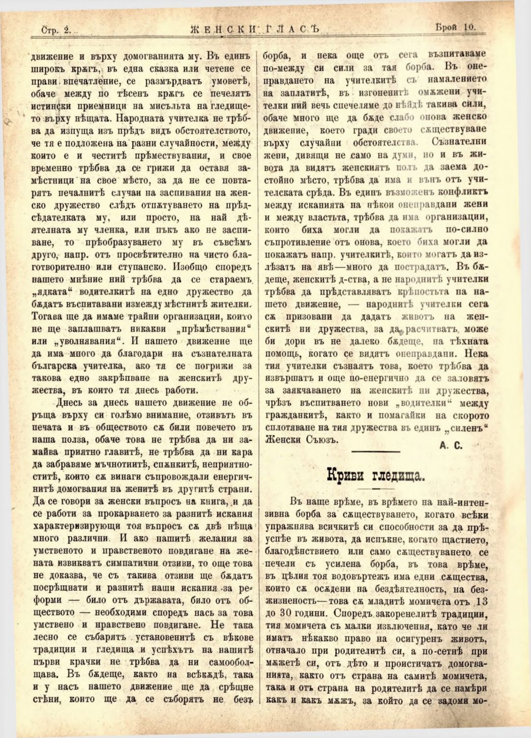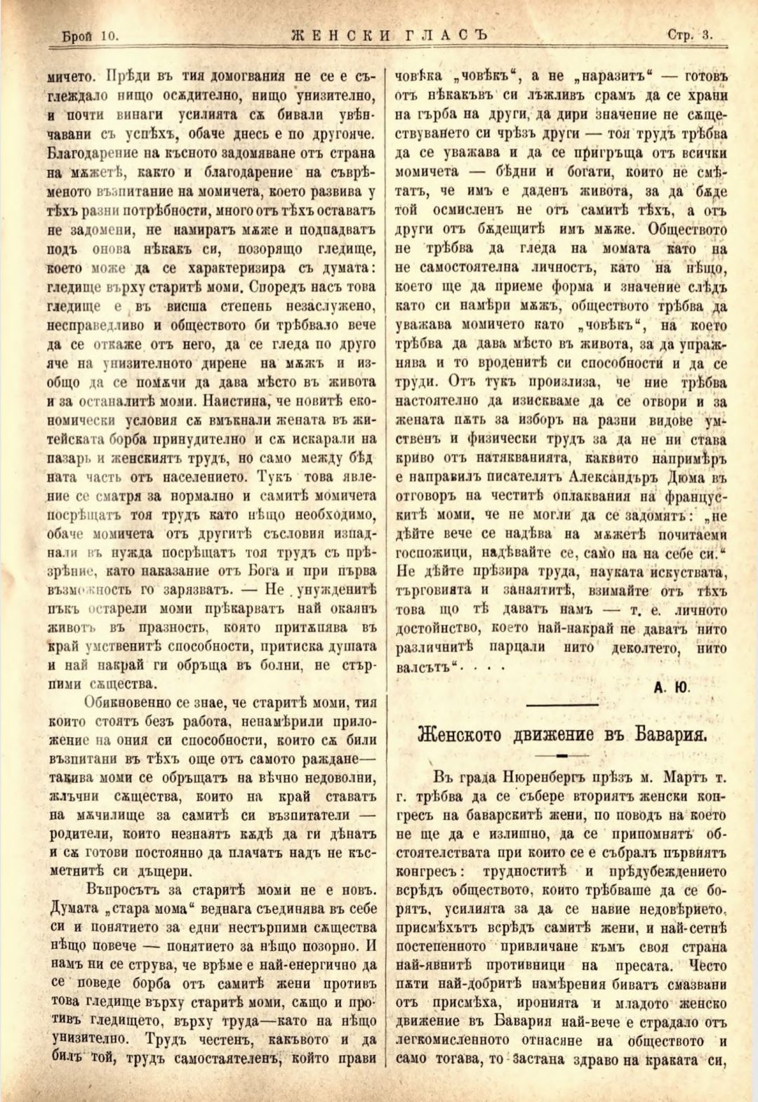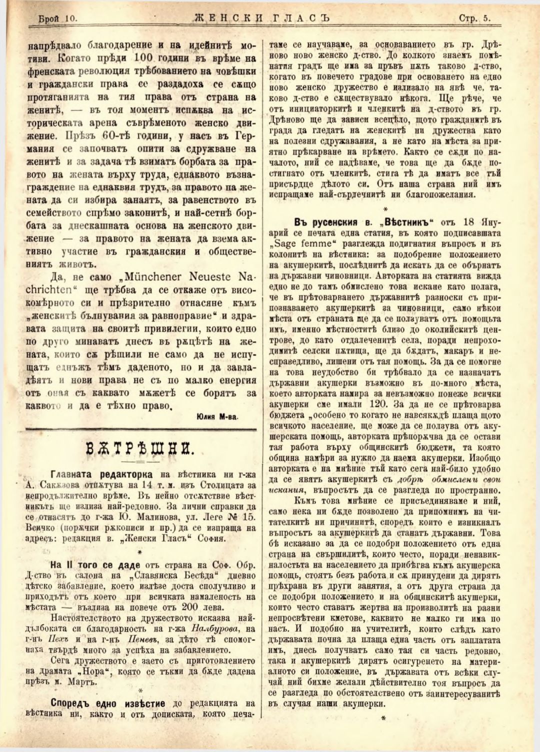 Год. 2,№ 10. Женски глас : Орган на софийското женско образователно дружество