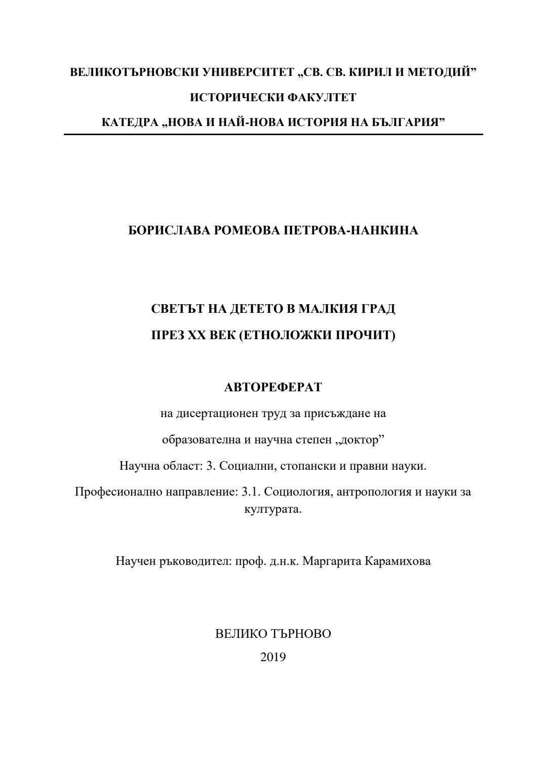 Светът на детето в малкия град през ХХ век (етноложки прочит) : Автореферат / Борислава Петрова ; Науч. ръководител Маргарита Карамихова