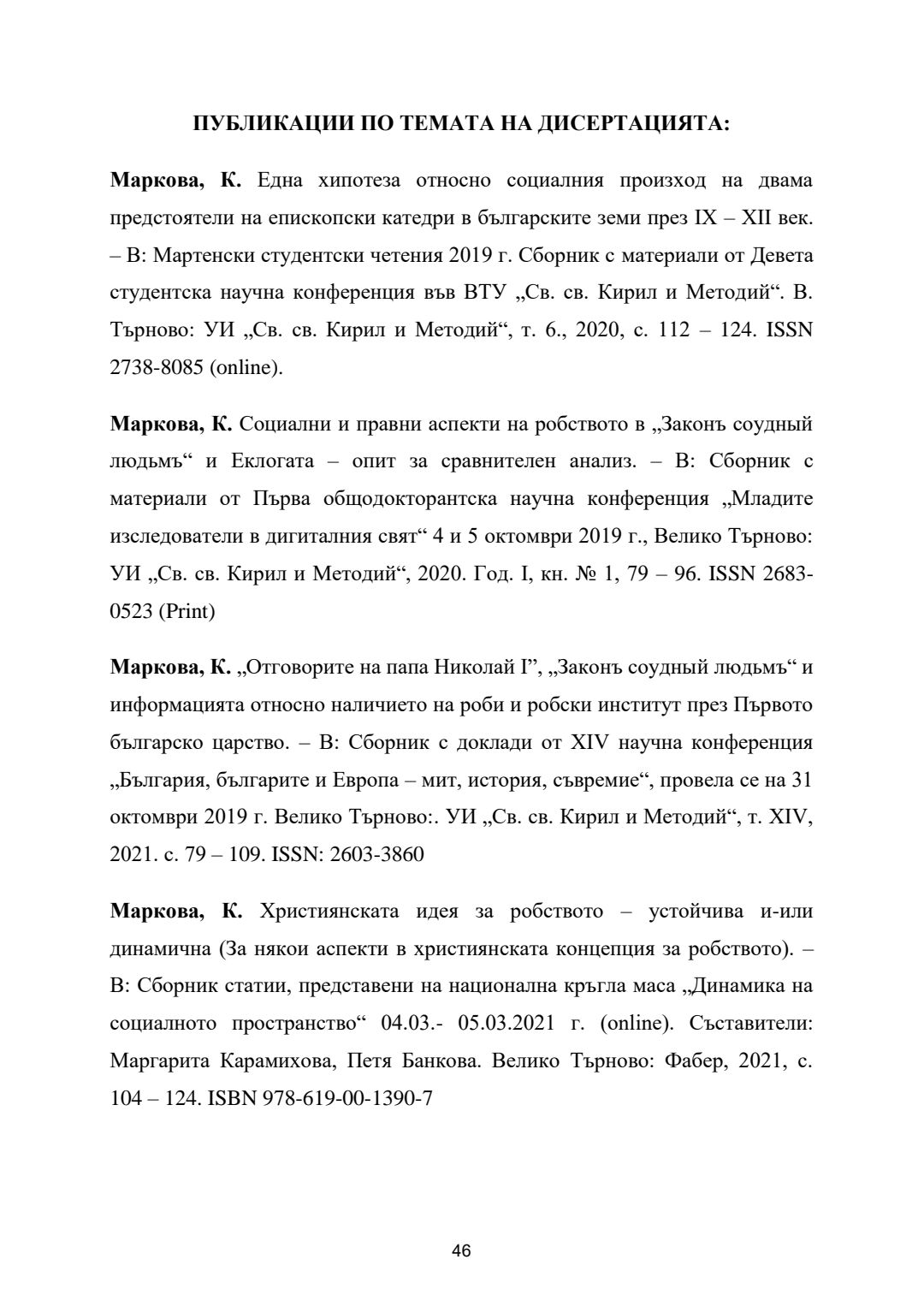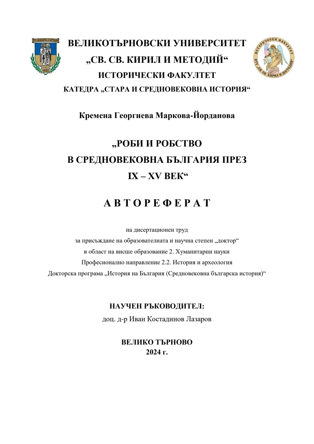 Роби и робство в Средновековна България през IX - XV век : Автореферат / Кремена Георгиева Маркова-Йорданова ; Науч. ръководител Иван Лазаров
