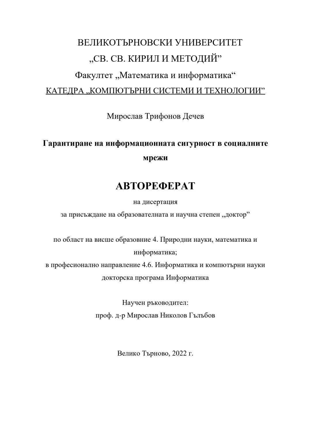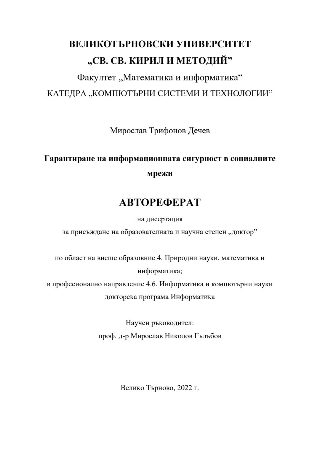 Гарантиране на информационната сигурност в социалните мрежи : Автореферат / Мирослав Трифонов Дечев ; Науч. ръководител Мирослав Гълъбов