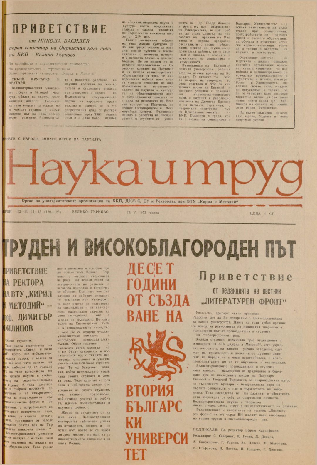 Год.12,12-13-14 (120-123). Наука и труд : Орган на институтските комитети на БКП, ДКМС, СУ и Ректората при ВПИ "Братя Кирил и Методий"