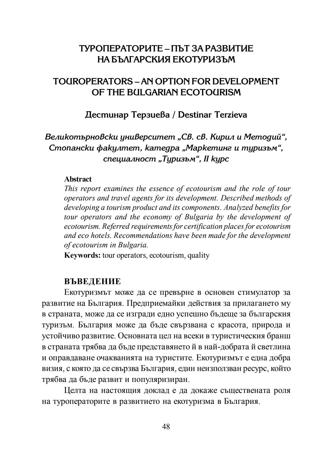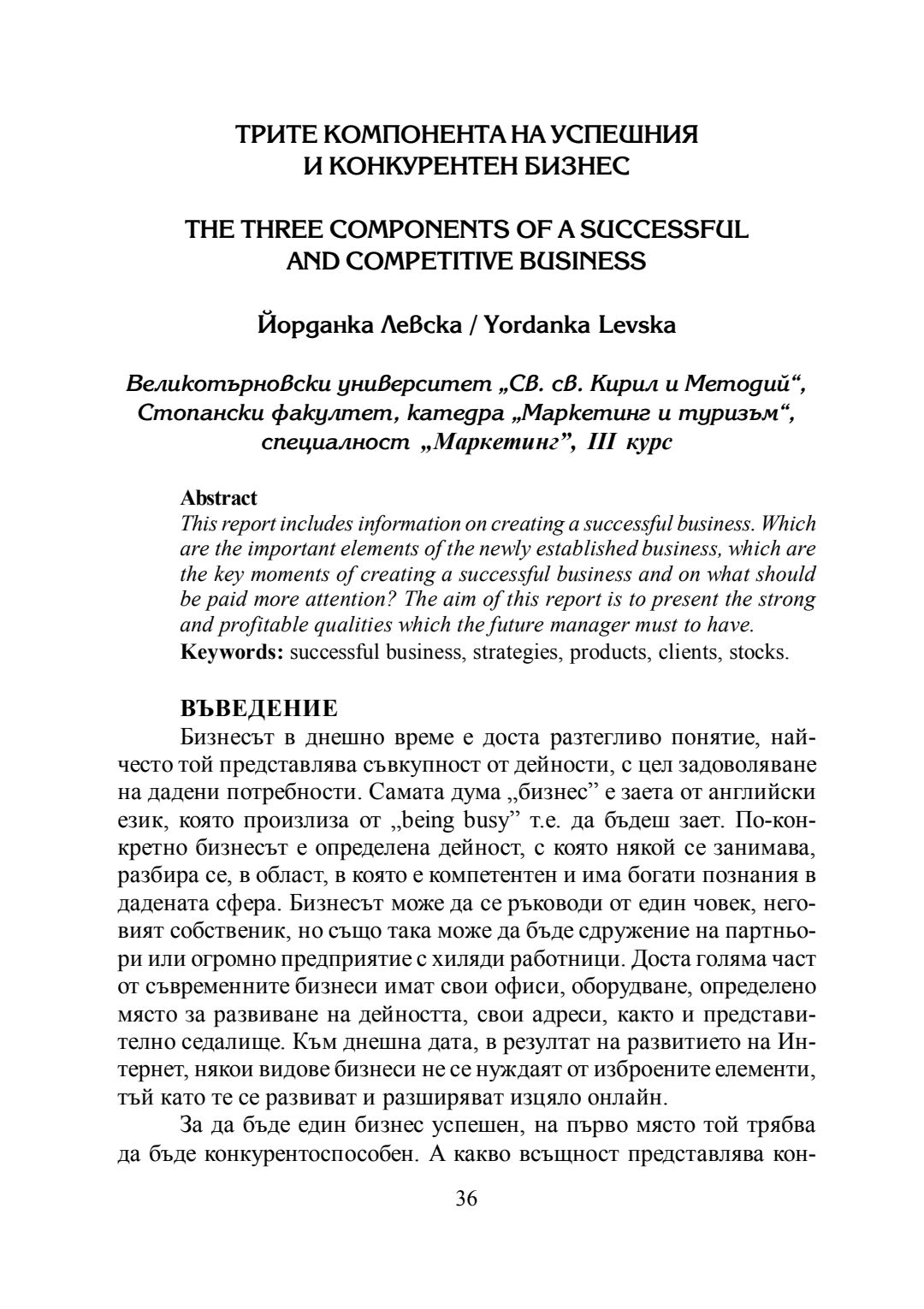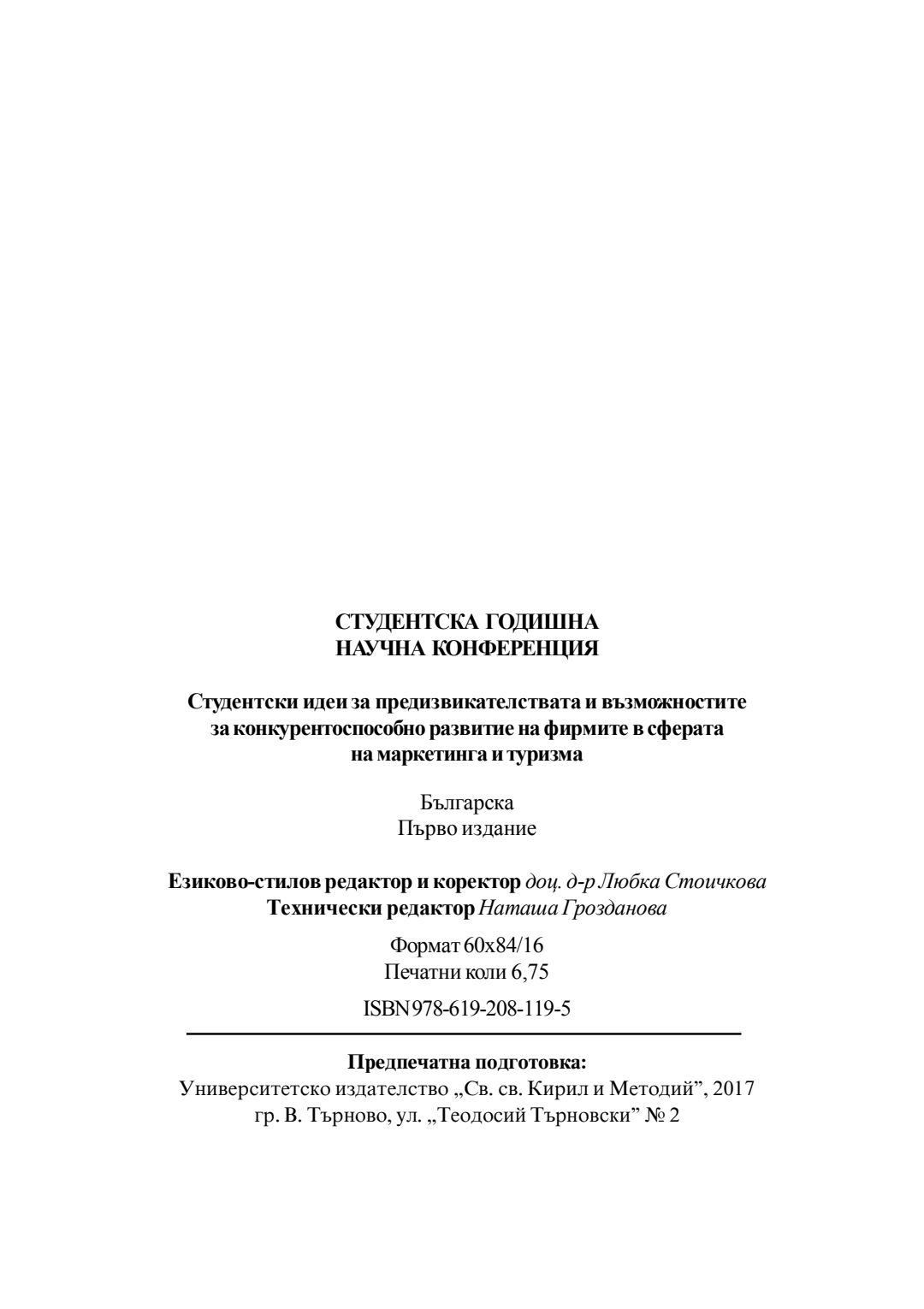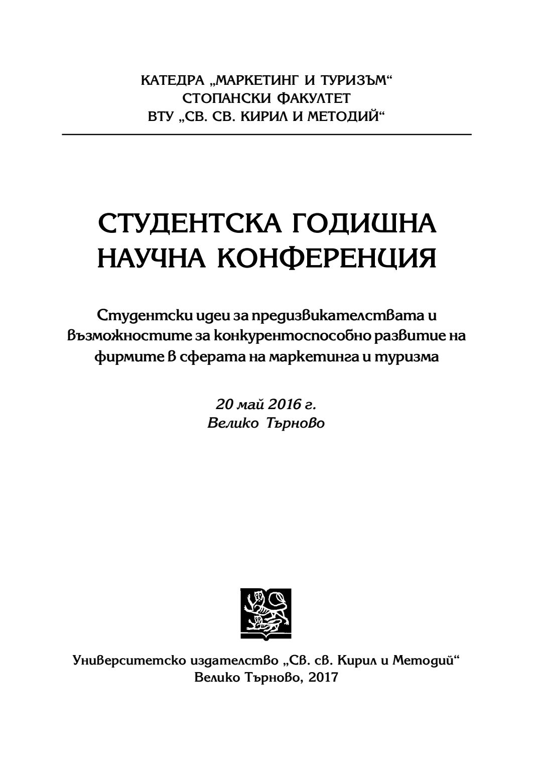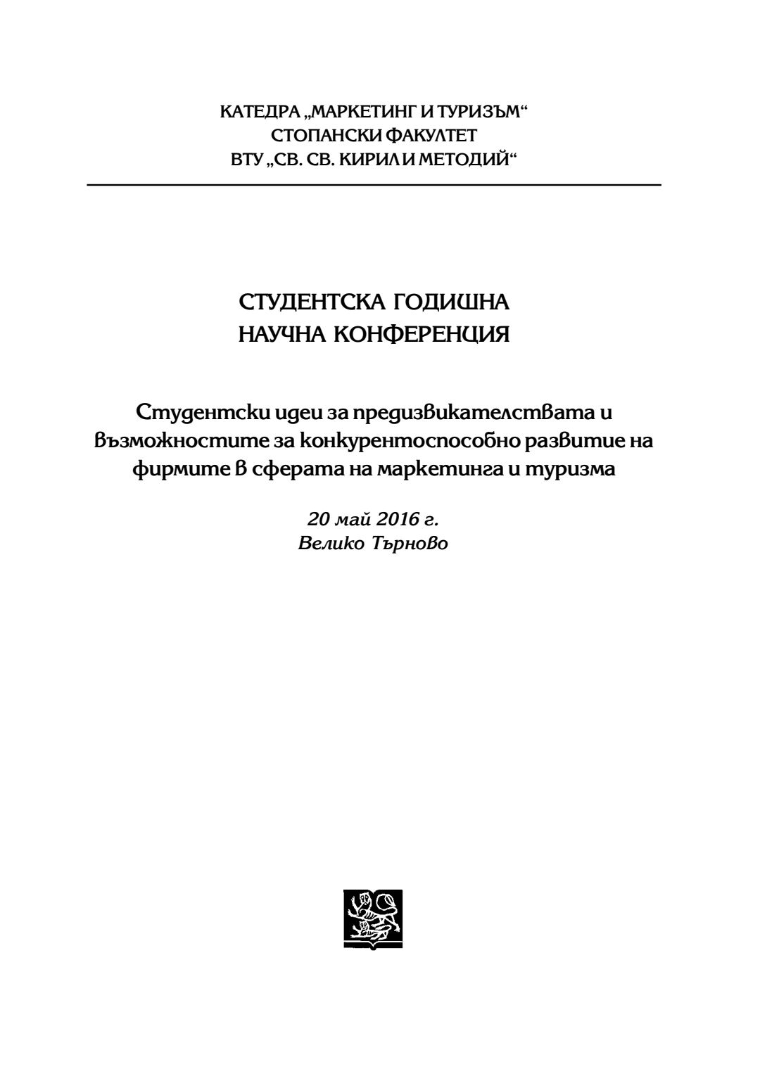 Студентска годишна научна конференция "Студентски идеи за предизвикателствата и възможностите за конкурентоспособно развитие на фирмите в сферата на маркетинга и туризма" [на] катедра Маркетинг и туризъм към Стопански факултет на Великотърновския университет "Св. св. Кирил и Методий", 20 май 2016 г., Велико Търново