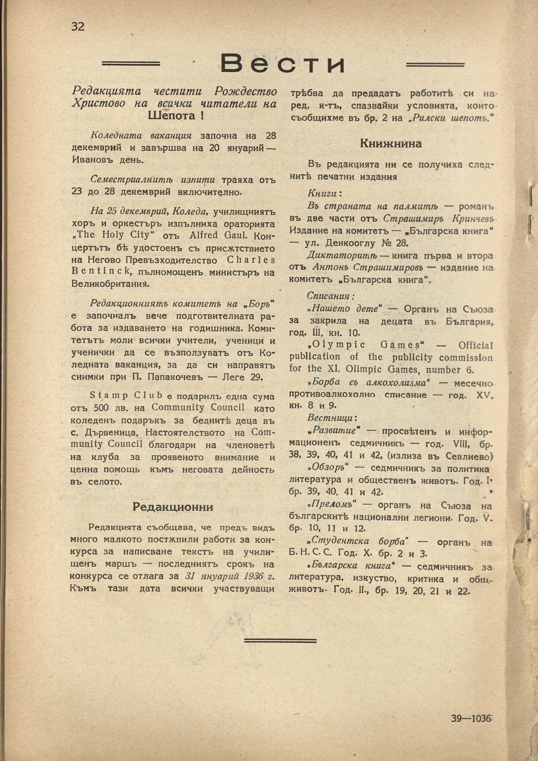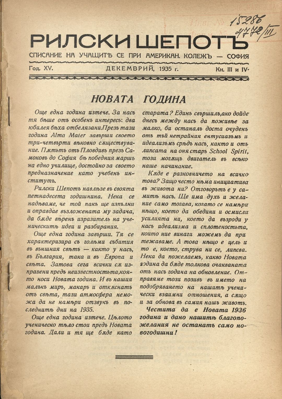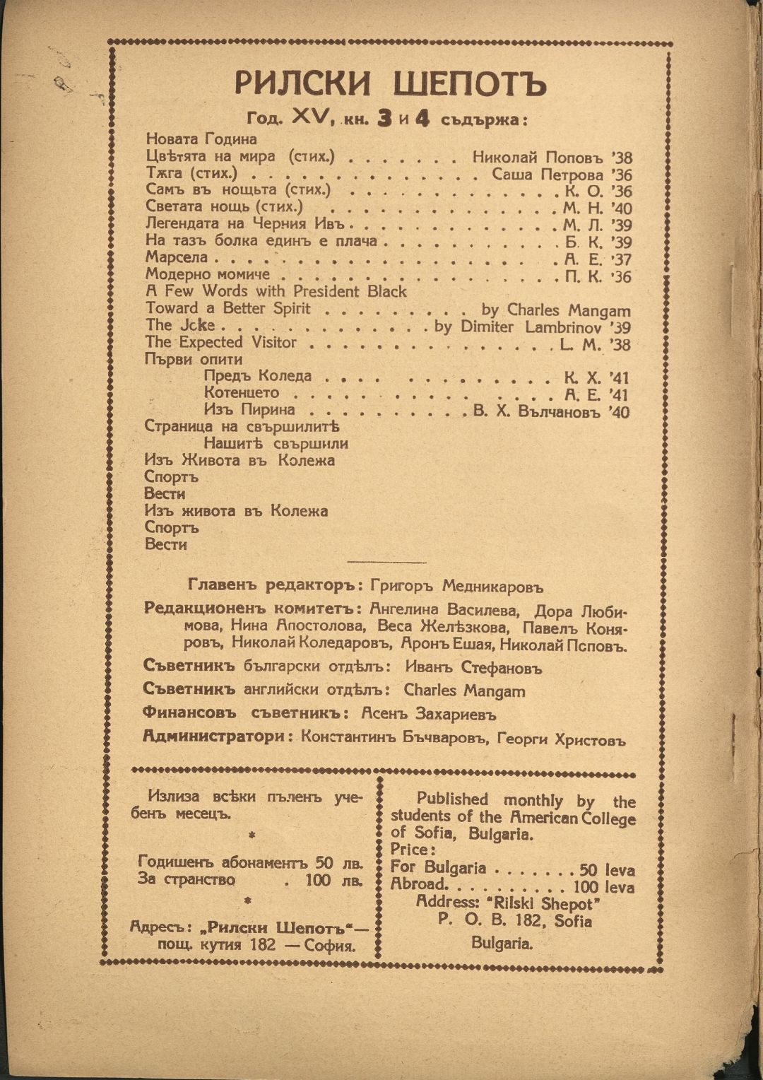 Год. 15, Кн. 3-4. Рилски шепот : Орган на учащите се при Американския колеж - София / Американски колеж - София