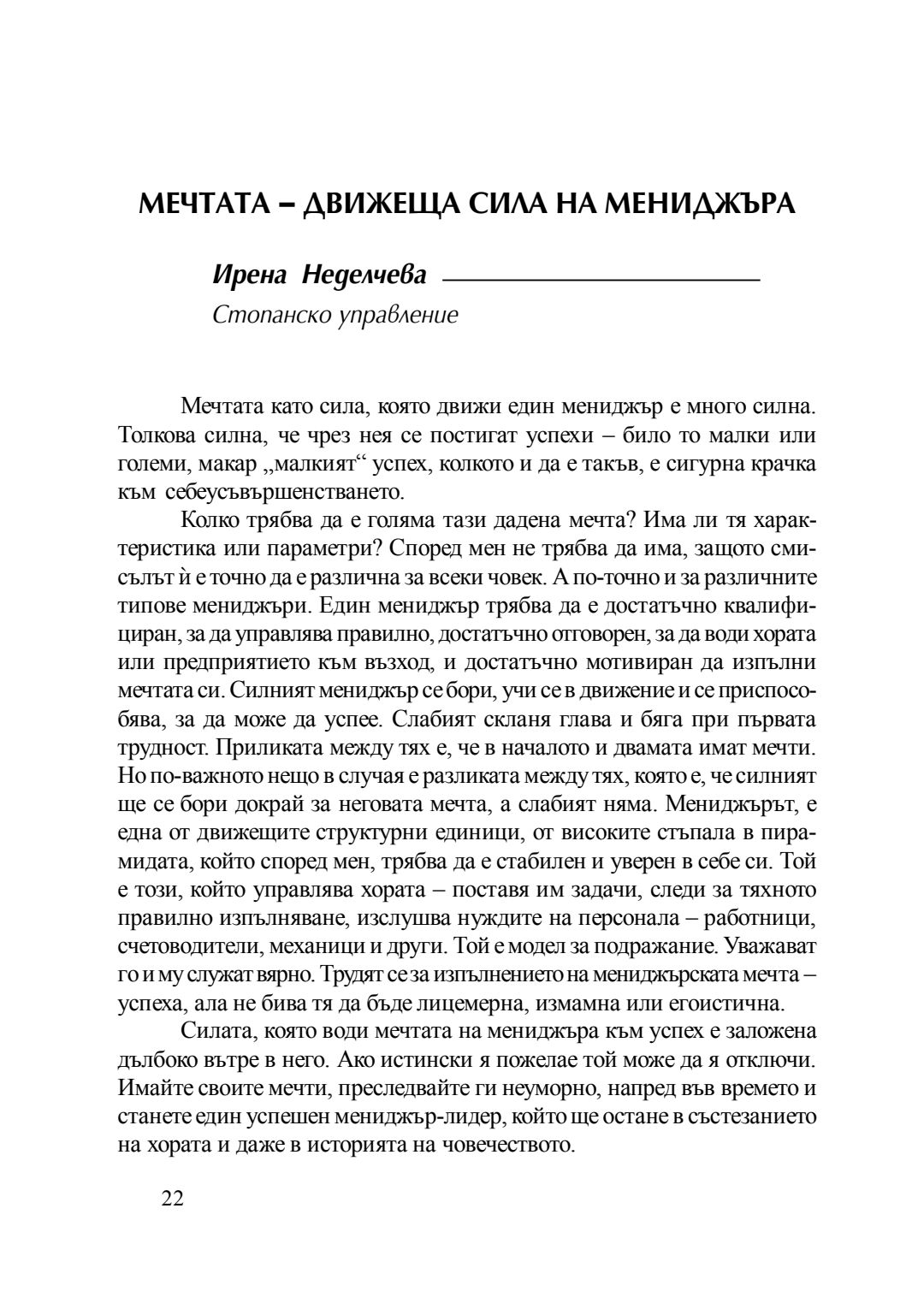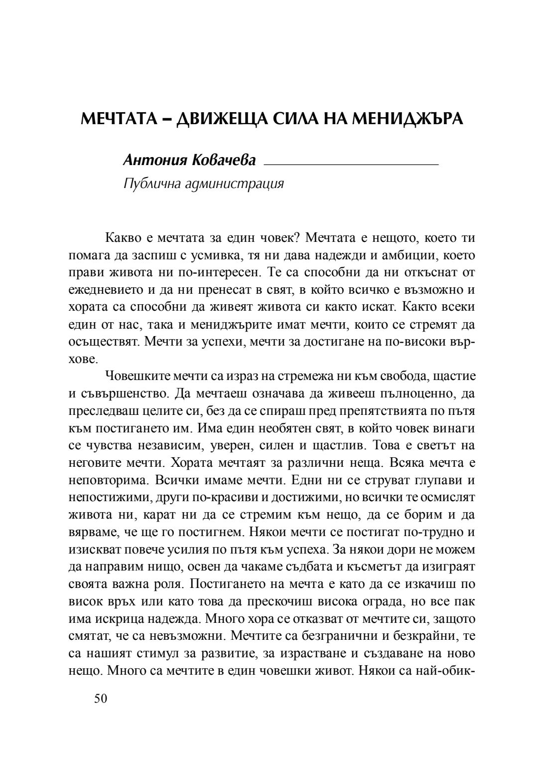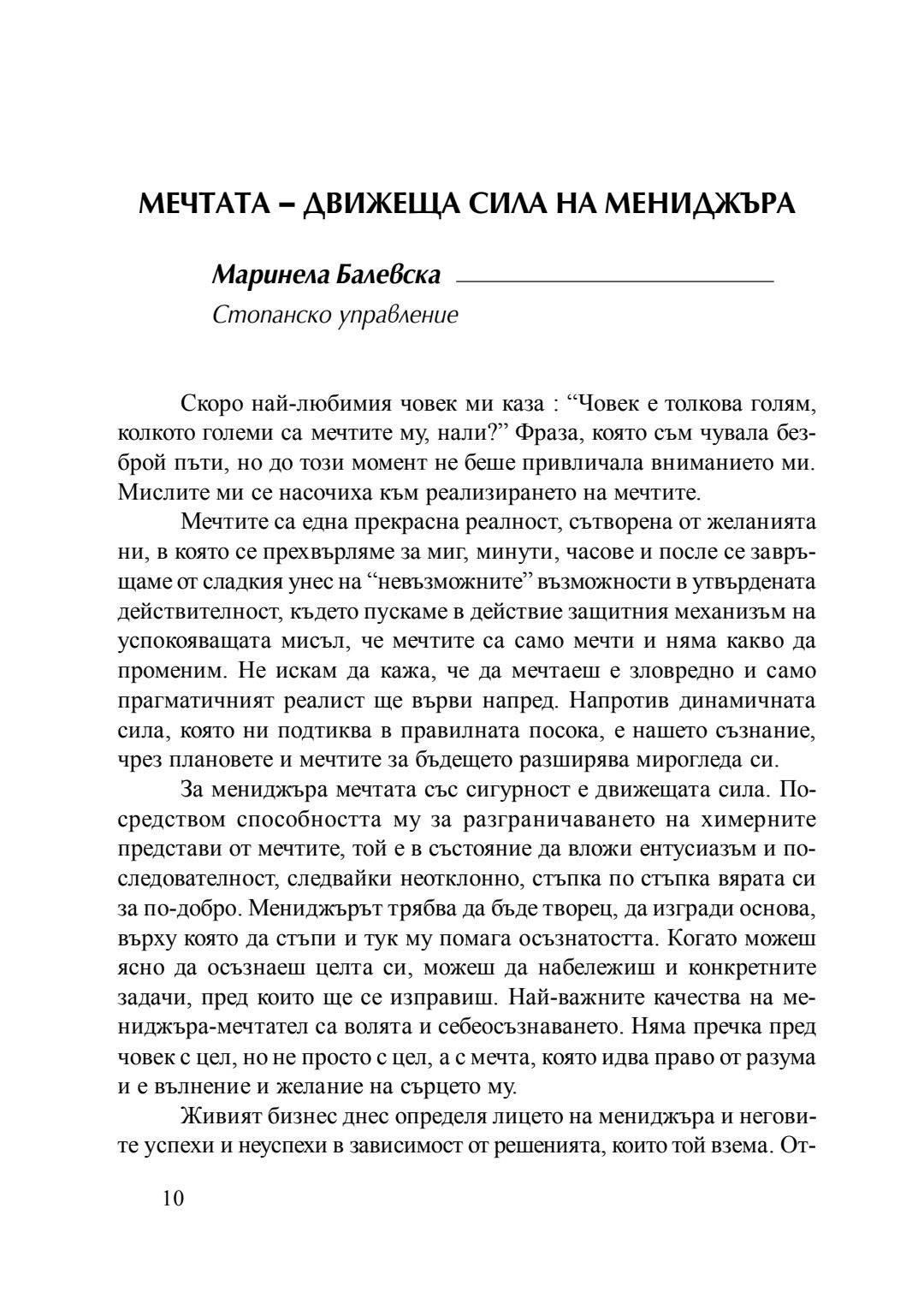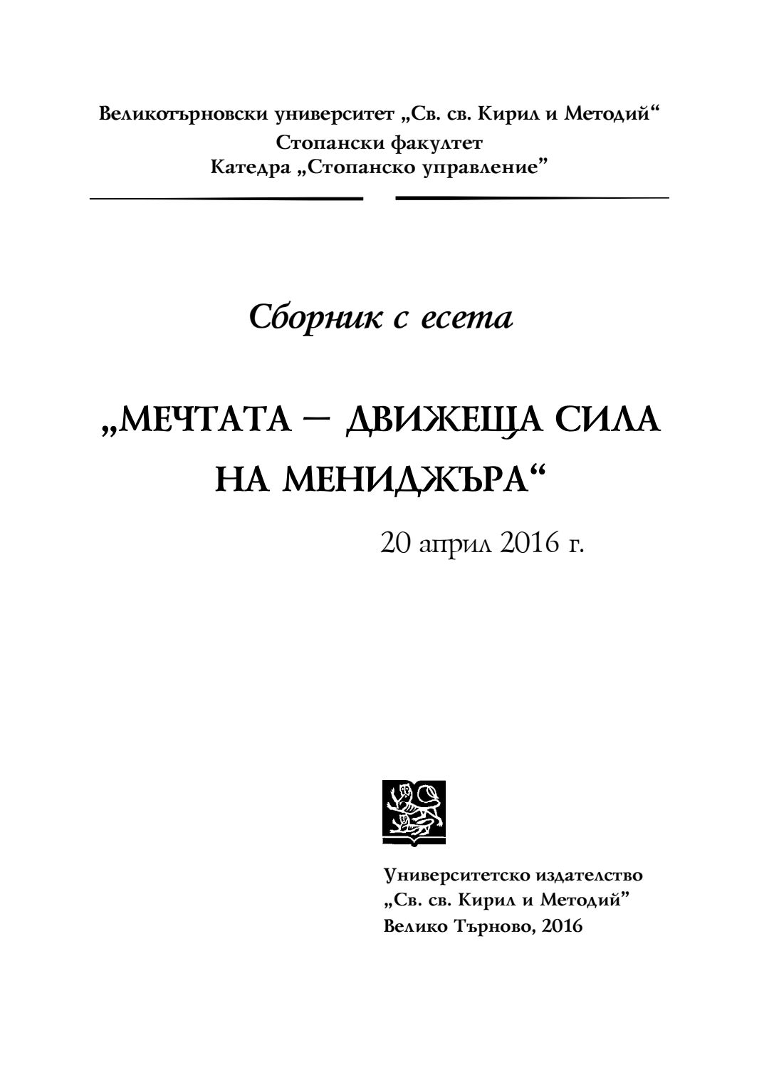 Мечтата - движеща сила на мениджъра : сборник с есета [от студентски конкурс], 20 април 2016 г.
