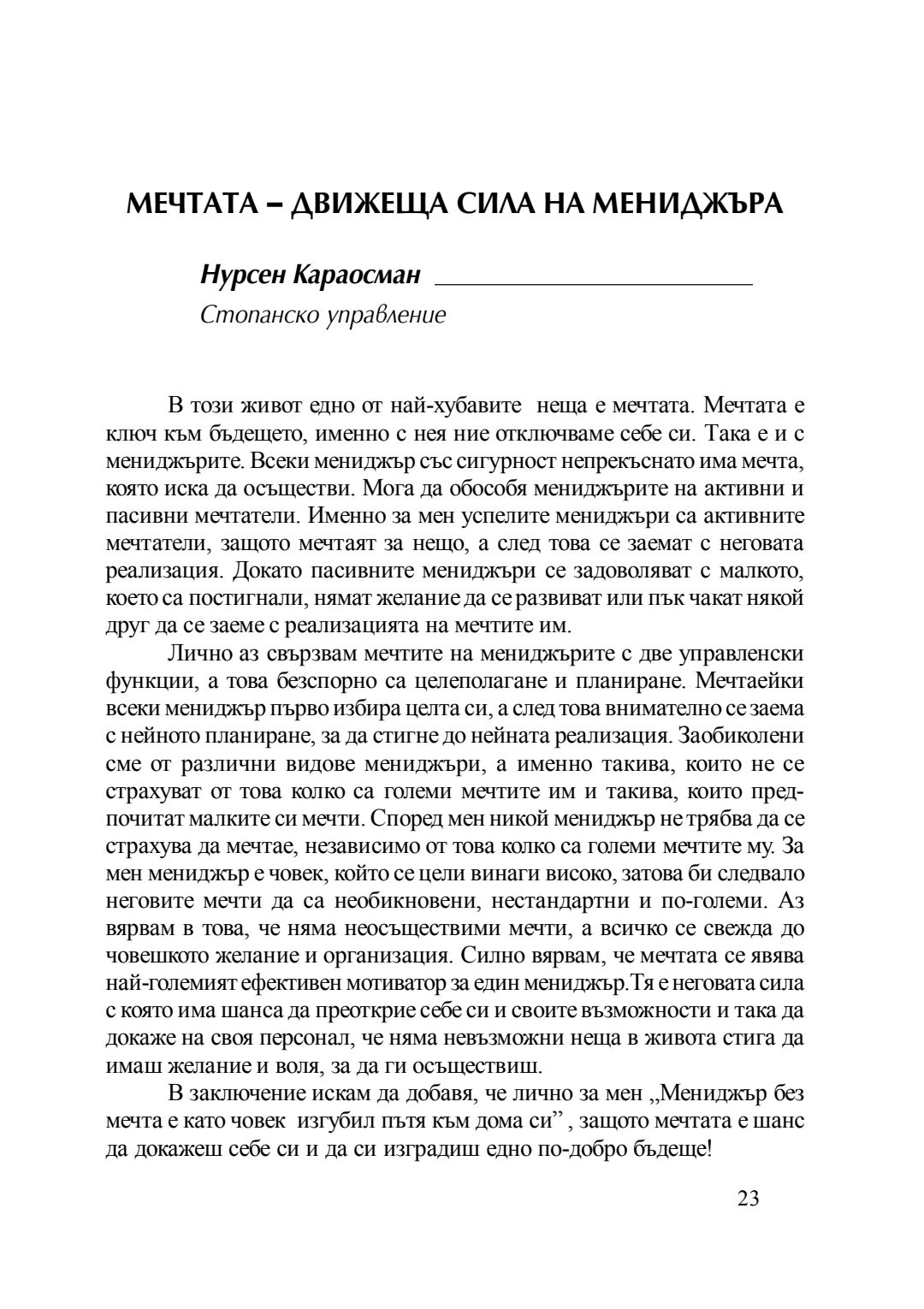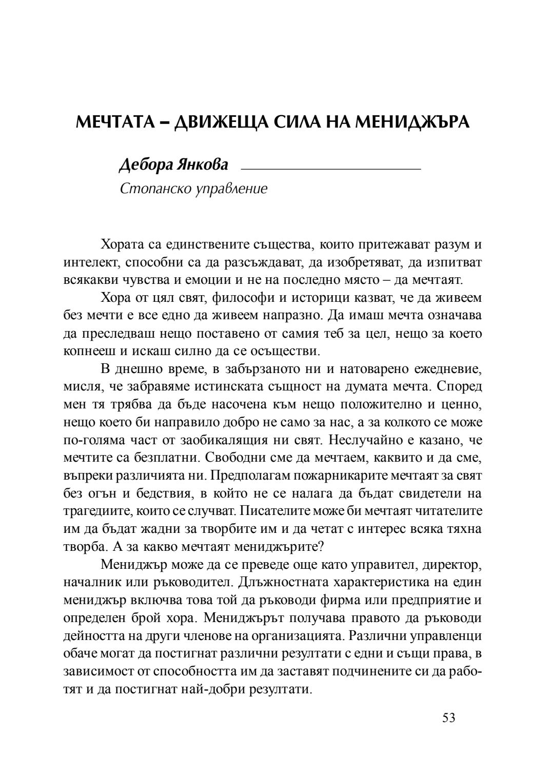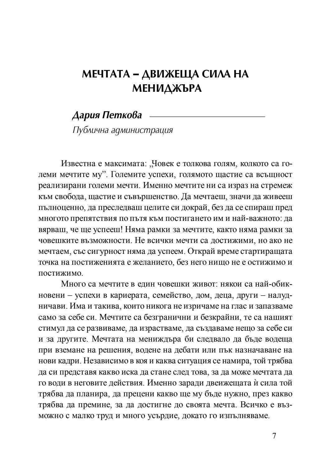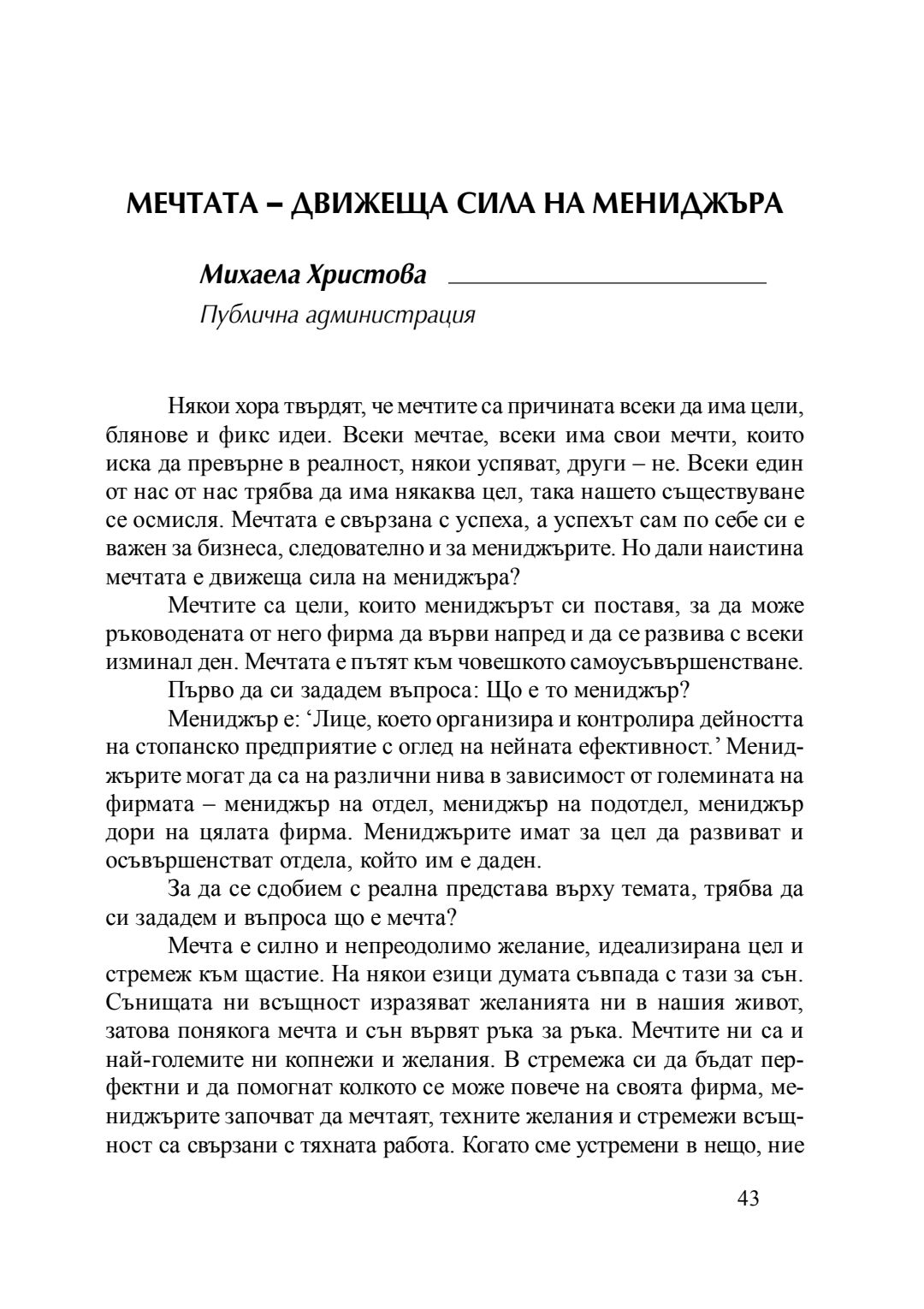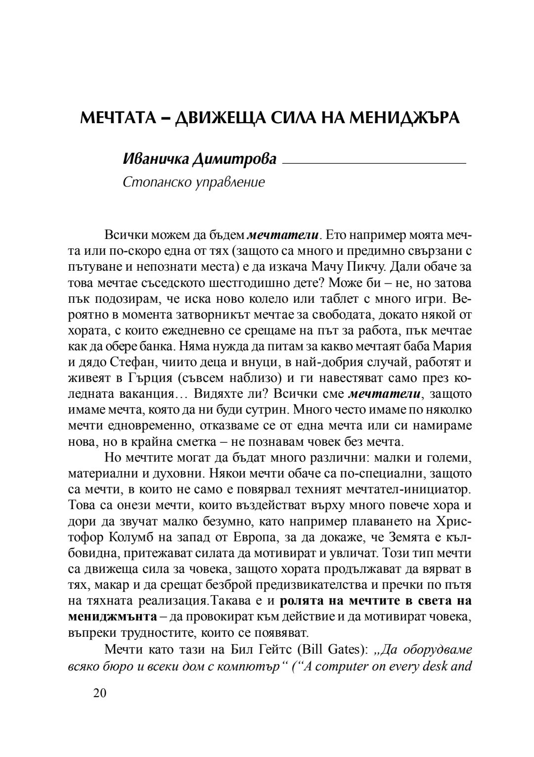 Мечтата - движеща сила на мениджъра : сборник с есета [от студентски конкурс], 20 април 2016 г.