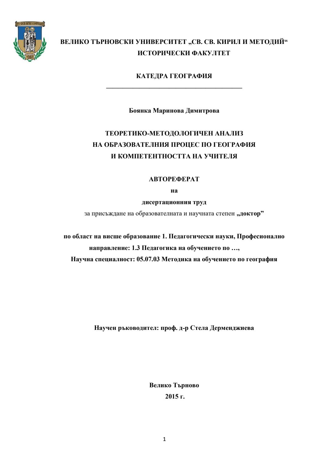 Теоретико-методологичен анализ на образователния процес по география и компетентността на учителя : Автореферат / Боянка Маринова Димитрова ; Науч. ръководител Стела Дерменджиева