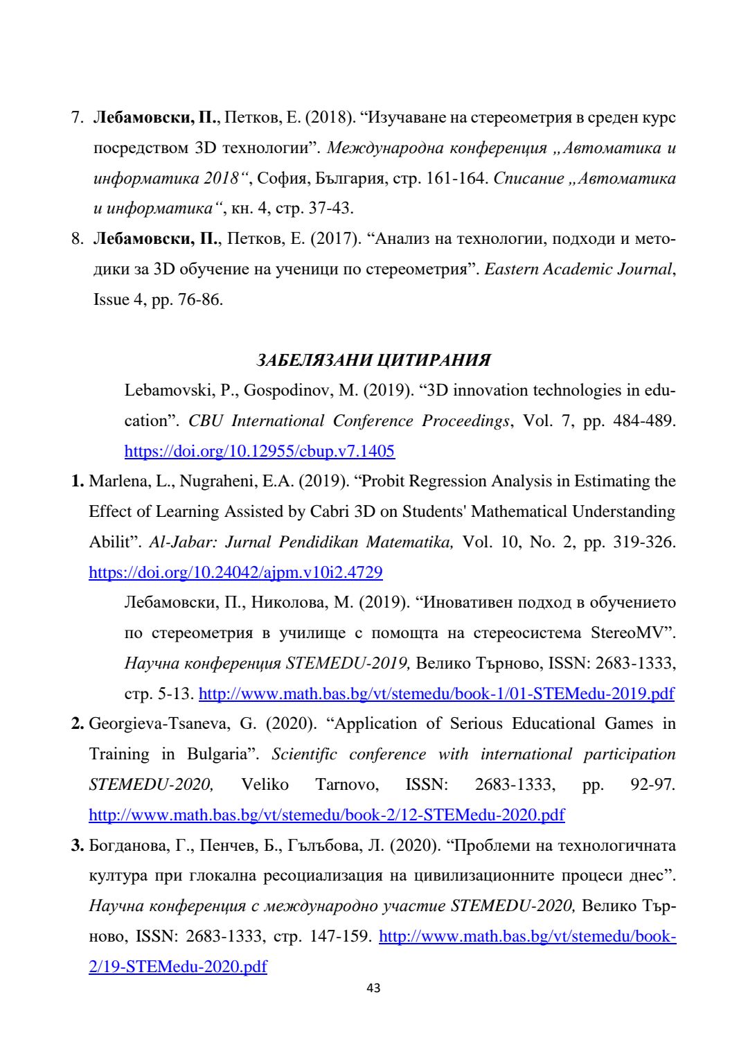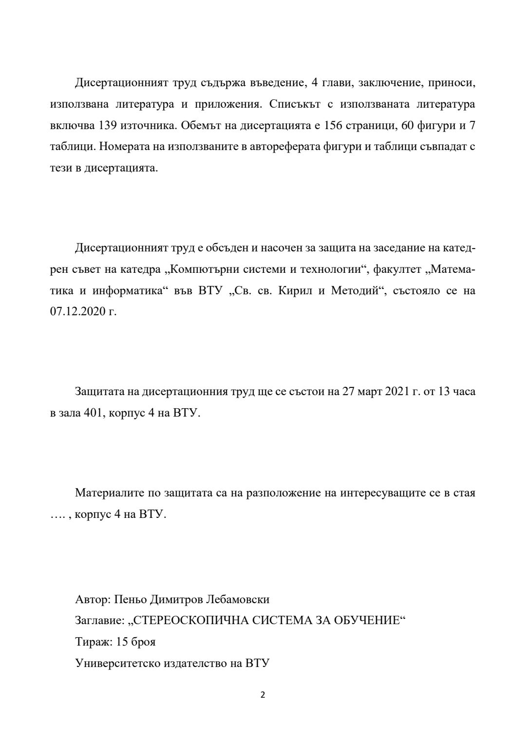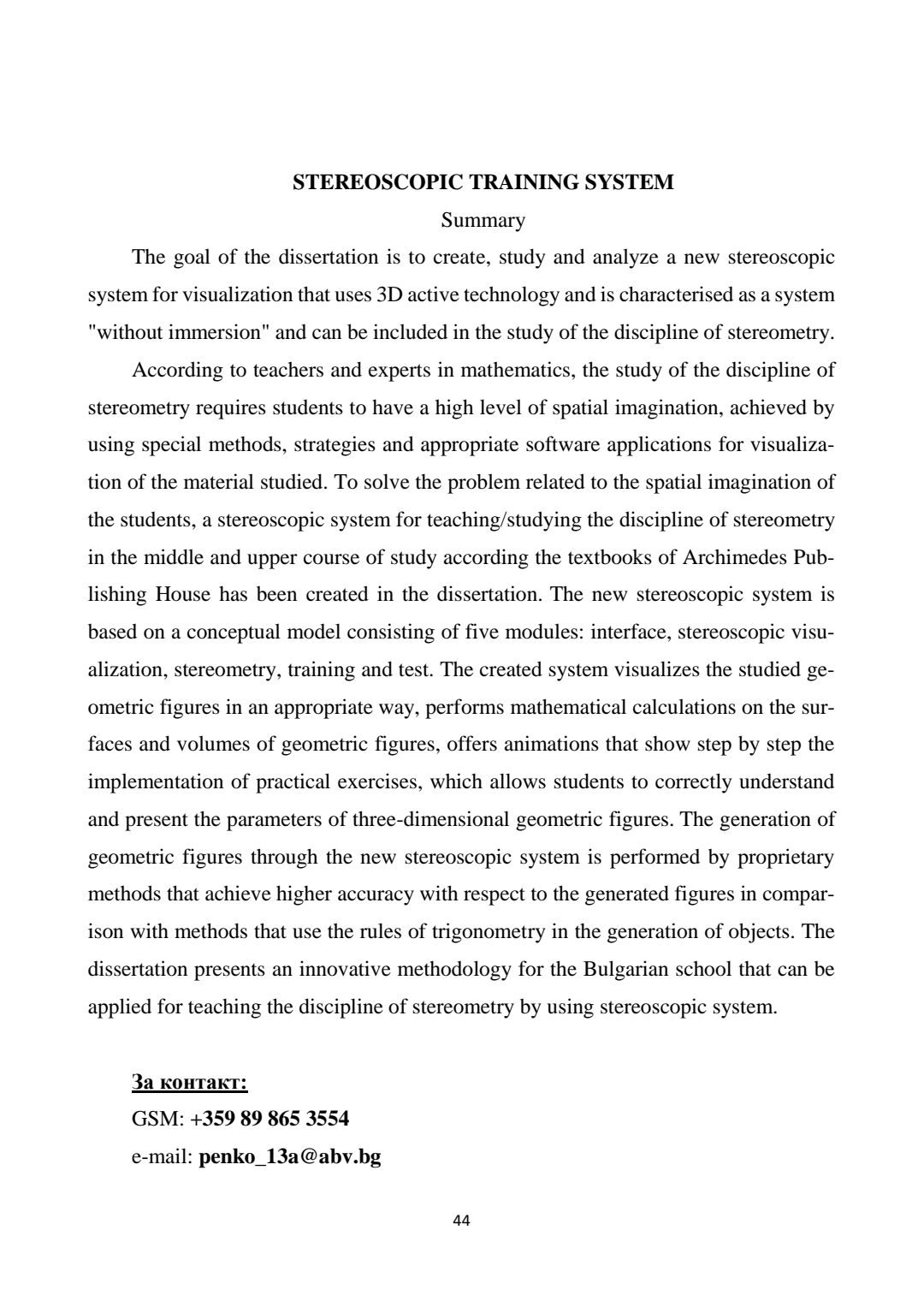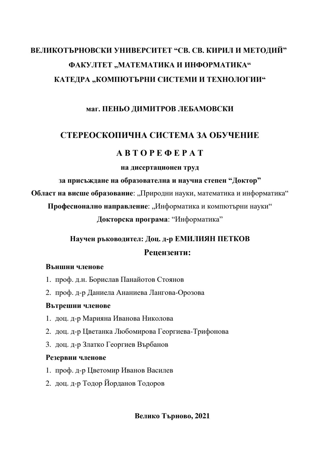 Стереоскопична система за обучение : Автореферат / Пеньо Димитров Лебамовски ; Науч. ръководител Емилиян Петков