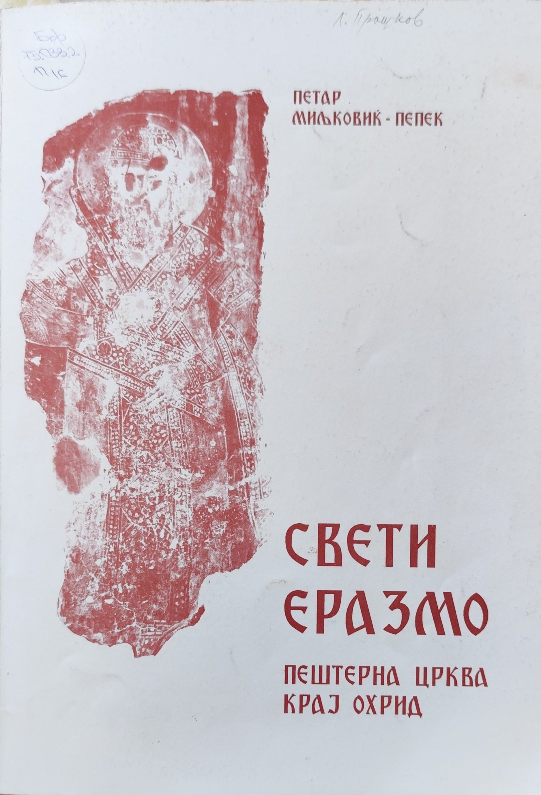 Милкович-Пепек, Петар. Пештерната црква Свети Еразмо краj Охрид / Петар Милкович-Пепек. - Скопjе : Републ. завод за заштита на спомениците на културата, 1994. - 83 с. : с ил. ; 29 см.