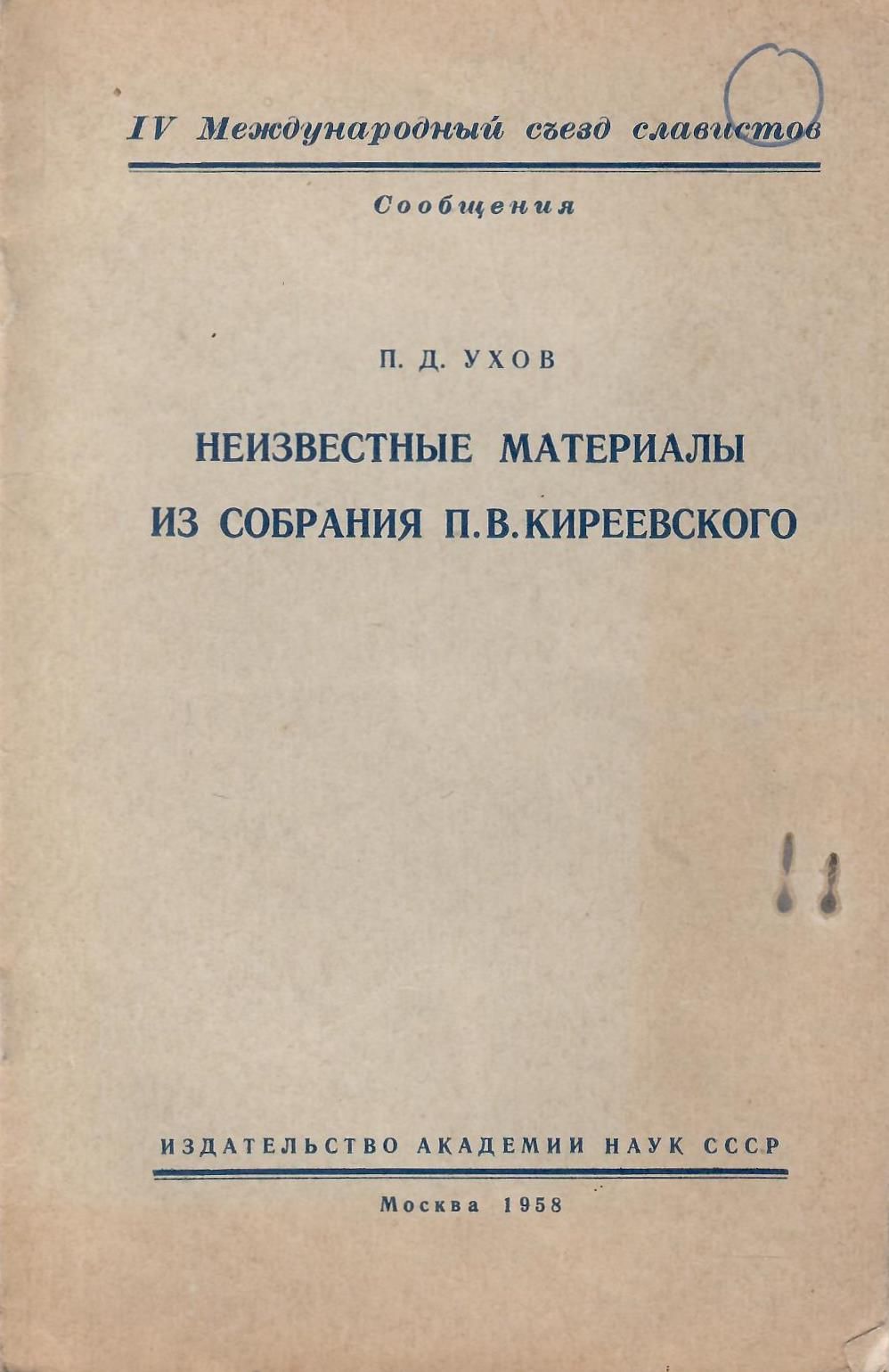 Неизвестные материалы из собрания П. В. Киреевского / П. Д. Ухов ; Издательство Академии наук СССР. – Москва : Издательство Академии наук СССР, 1958. – (IV Международный съезд славистов. Сообщения).